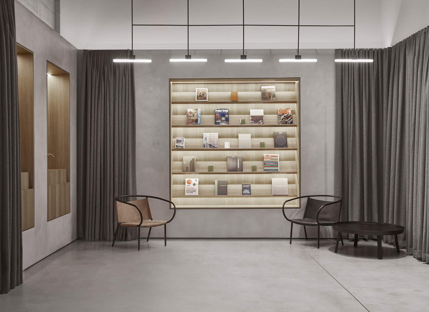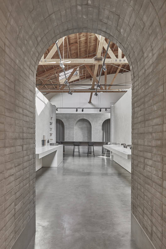 空间规划与功能整合:在旧工厂内构建旗舰展厅,通过产品定位、材质运用与空间层次划分,巧妙融合展示区与建筑架构。系列纪念性插入物构建多元区域,既区分不同功能,又以拱门相连,营造出流畅且富有仪式感的空间体验,打破传统展厅局限,使空间与品牌理念相得益彰。