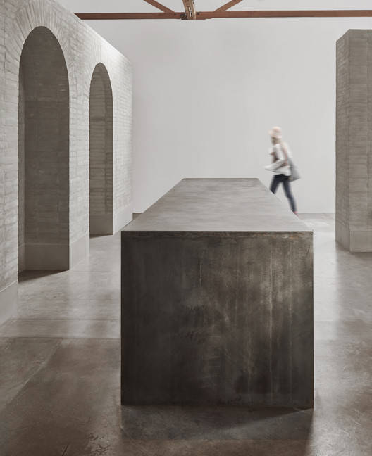 为了增强插入物的纪念性外观,我们选择了Danish格式的砖堆,并使用了德国的“Ziegal Geschlammt”砂浆,意思是“覆盖”或“重覆盖”。这个过程模糊了砖块的单位节奏,形成了一个整体表面。混凝土基座使砖结构看起来接地,给人一种它们一直建在现有混凝土地板上的感觉,并且结构的粗糙(永久)砖砌和展示背景的光滑(临时)灰泥之间的关系令人愉悦。