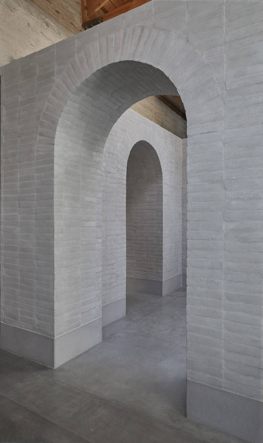 入口“门户”拱门标志着旅程的开始,是从入口区域到画廊的过渡。它被定位为遮挡视轴,直到进入画廊的那一刻。拱门沿着轴线排列,暗示着灵性和仪式净化的主题。就像教堂或大教堂一样,这些干预措施建立了一个简单的空间结构。继续类比,从前廊可以看到一个中央中堂,两侧是两个侧堂。