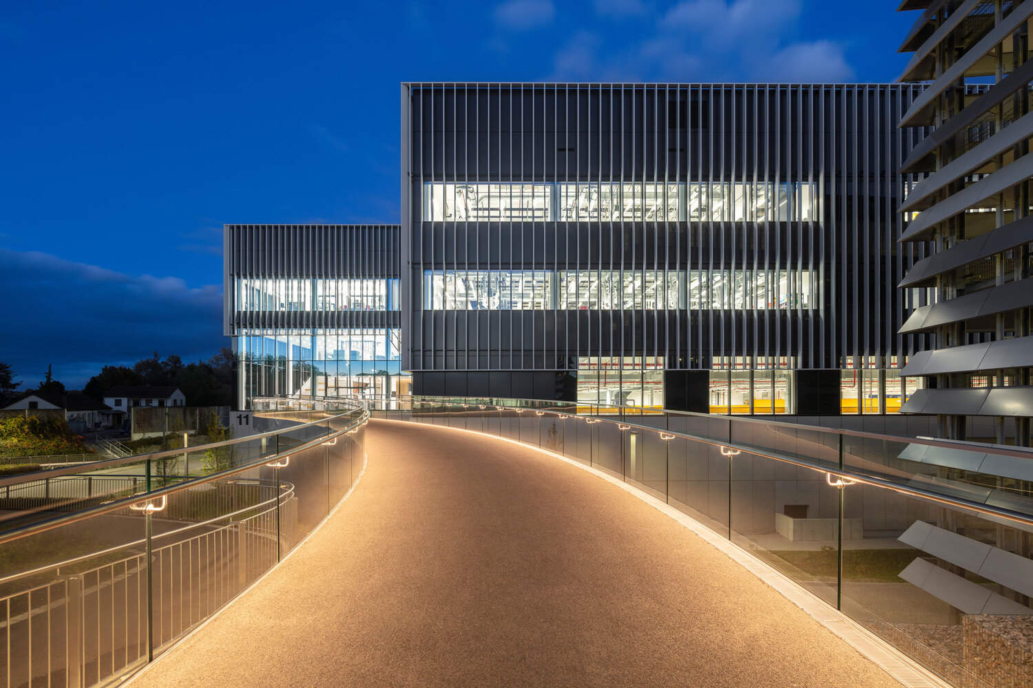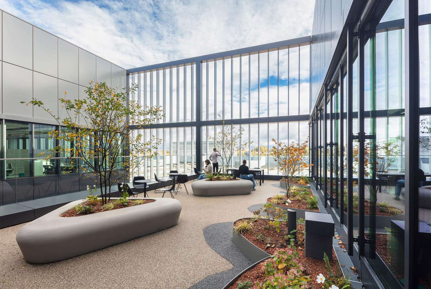一个旨在连接的空间——这座建筑本身就体现了连接的理念。一个中央“总部大楼”是综合体的核心,实验室、测试场和办公室围绕着光线充足的中庭布置。开放式平面图和精心布局的露台庭院模糊了工作区之间的界限,鼓励了互动和知识交流。