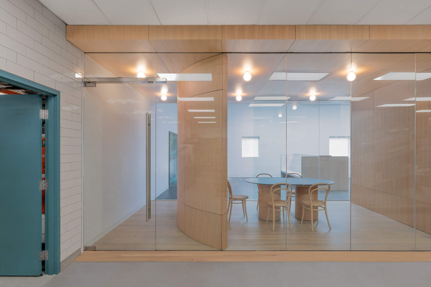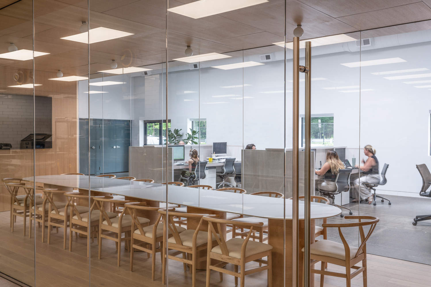 Guests move freely through the open-plan office side, where large custom furniture pieces define areas for collaborative work, casual seating, and office administration. On either side of the large space, private offices and connecting halls are clad in blue-green panels that offset the unfinished trussed ceilings above. The paneling uses color to unify doorways, windows, and kitchenette millwork and to differentiate the semi-back-of-house experience for guests on their way to individual bathrooms. While prioritizing the culinary team's employees and workflows in the renovation's design, the building also warmly welcomes guests with its blend of raw and refined spaces. Its layout of adaptable rooms and seamless visual continuity allows the building to support external events while also serving as a compelling event venue on its own. "Our clients work on everything from no-waste dinners, to teaming with wine producers for intimate tastings, to serving thousands at large public events, so there's no one-fits-all solution," says ABA partner Emily Abruzzo. "To support their activities from testing and experimentation to high-yield production, to seamless and chic on-site hosting, the design provides character while allowing for tremendous flexibility and openness."