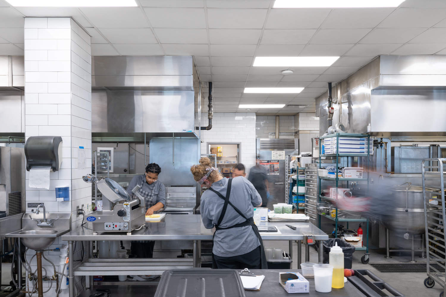 Tucked away in an industrial complex, the original building lacked light, comfort, and connectivity. A key challenge was introducing natural light into the centrally-located kitchen, the roof above which was fully obstructed by ductwork. Utilizing an adjacent area with minimal rooftop equipment, large rhythmically arranged skylights were added to bring light into a spacious, gallery-like open office. 50-foot-long parallel glazed walls are situated between the office and kitchen to distribute natural light deep into the building and foster connection between planning staff and chefs.