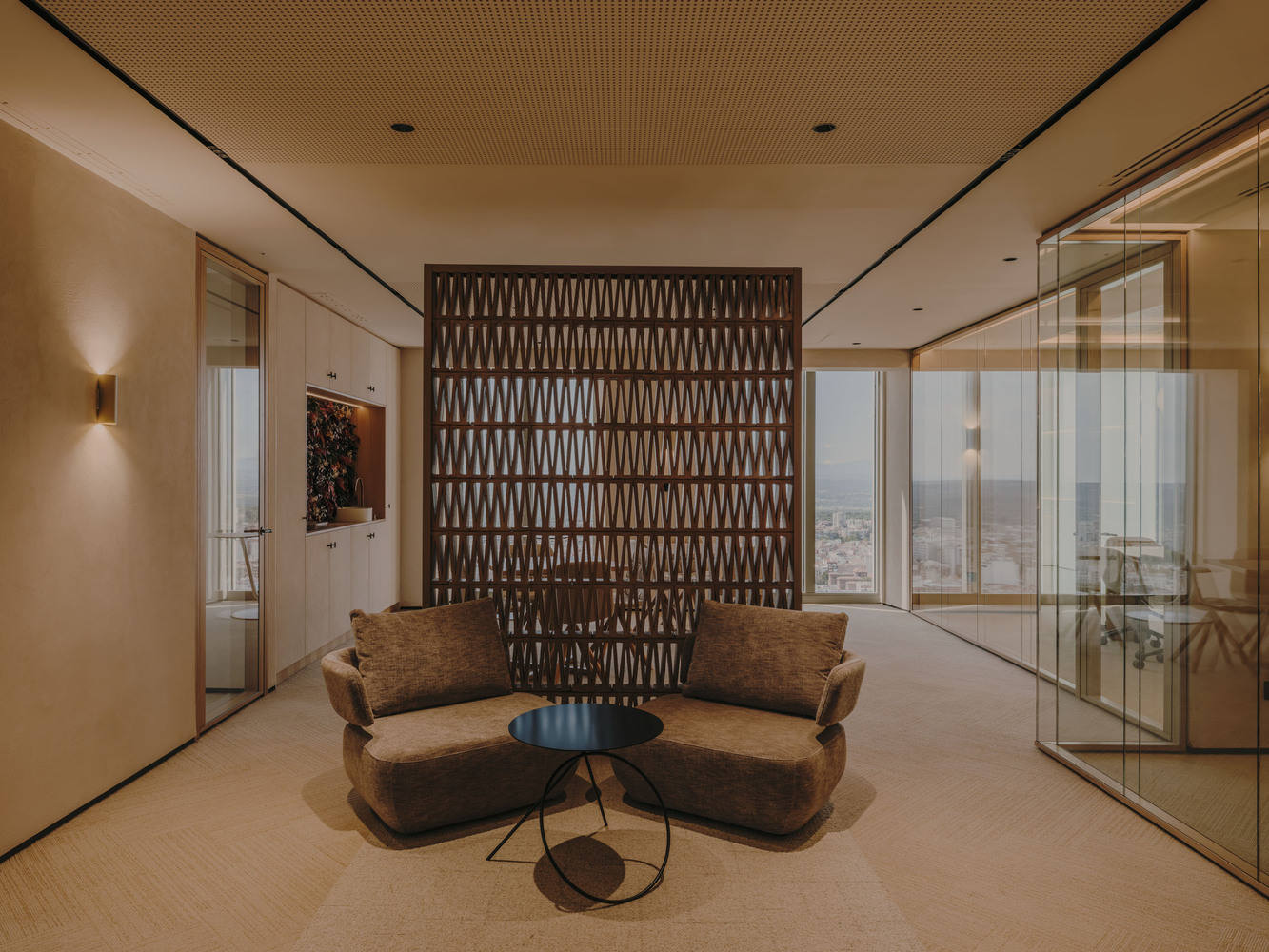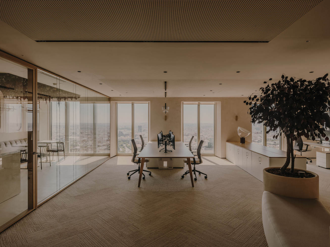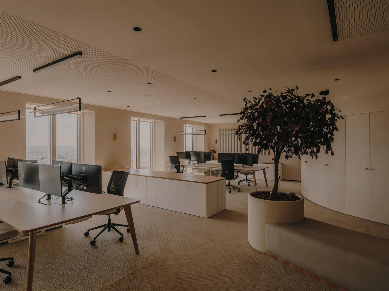 技术与自然和谐:该项目强调了从高空俯瞰的视角,并在不牺牲技术美学的前提下,赋予了办公室一种温馨的氛围。工作区的设计采用了粘土板和植被等材料,旨在消除呼吸环境中的有害颗粒,体现了将自然元素融入现代办公环境的设计理念。