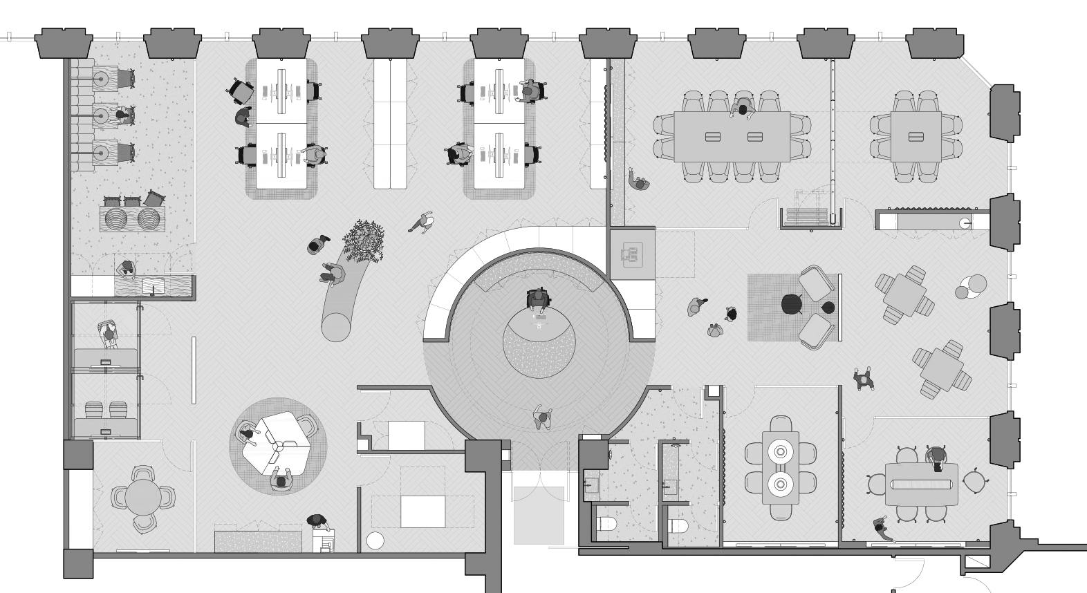 Given these premises, our proposal (which won) focused on clearly differentiating the working area from the commercial or meeting area and connecting these two areas by an iconic rotunda space that would serve as a reception area. In addition, we wanted to emphasize the views from this height at any point in the office, and give it a welcoming character that would avoid technological aesthetics without renouncing the use of such technology.