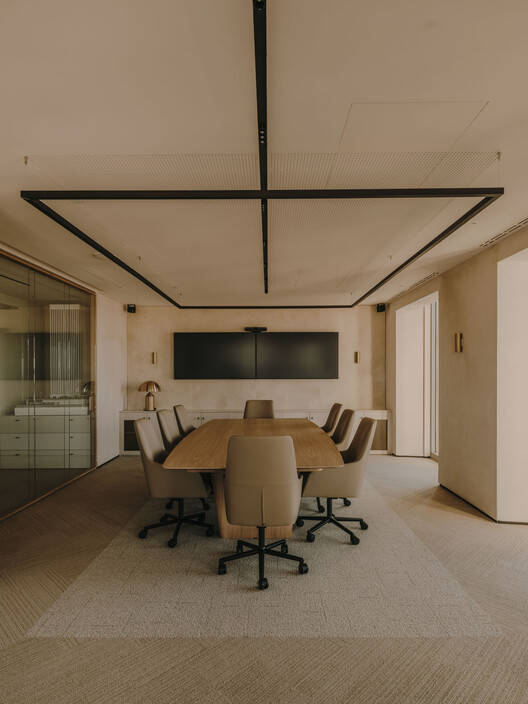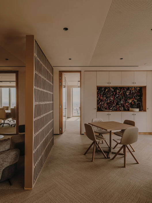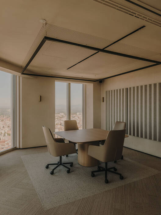Text description provided by the architects. The office on the 42nd floor of Torre Picasso (Madrid) was born from a competition in which the client had a peculiar program for only 4 permanent workers in an area of 330 m2, to which occasionally are added more employees coming from different company locations to hold meetings in the rooms of this office.