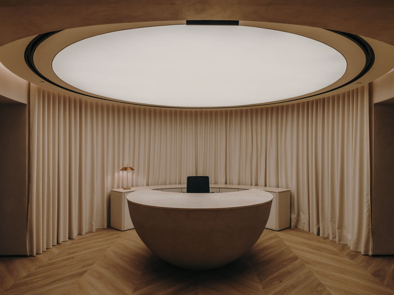 The reception is undoubtedly the most iconic space of the project, to create a first scenographic impact on visitors. It is designed in a circular plan, with concentric custom designed furniture and an illuminated stretch ceiling that homogenizes this space and compresses it to a lower height, before moving on to the decompression zones.