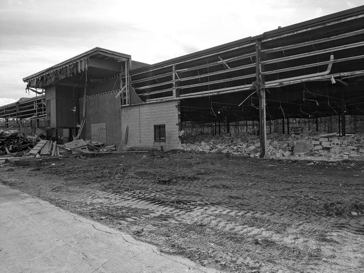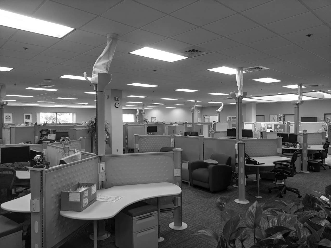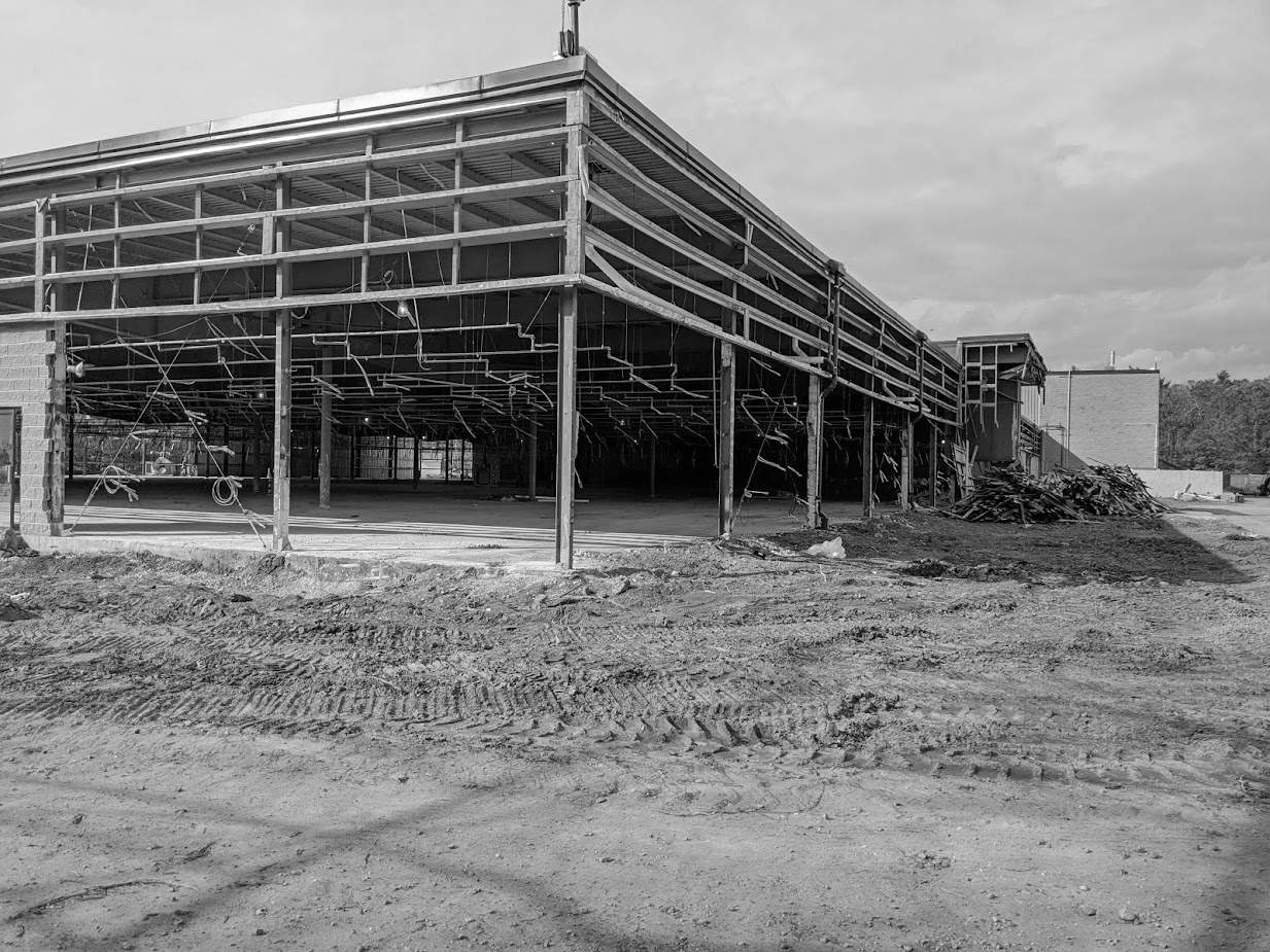 The initial phase of the project involved stripping the building down to its core elements: the slab, steel columns, and roof. Prior to this intervention, the building, which housed a combination of office, lab and warehouse areas, was clad in dented and damaged metal panels, with outdated architectural concrete masonry units (CMU) at the entrance. The overgrown landscape had obscured the building, and the limited fenestration allowed minimal natural light to penetrate the interior. The interior space functioned as a dismal labyrinth of cubicles and corridors, completely devoid of natural light.