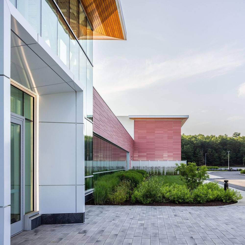为了创造一个高能效的外壳,设计团队使用了隔热金属板和赤陶雨幕系统的组合,将所有隔热材料都放在了外部。通过精心选择赤陶瓷砖的大小和颜色,Balance在广阔的立面上创造了色彩和运动的微妙变化。韦斯顿建筑供应公司监督了卸载和安装定制陶土的艰巨工作,这些陶土被乱运了——停车场在近一个月的时间里就像一个巨大的拼图游戏。