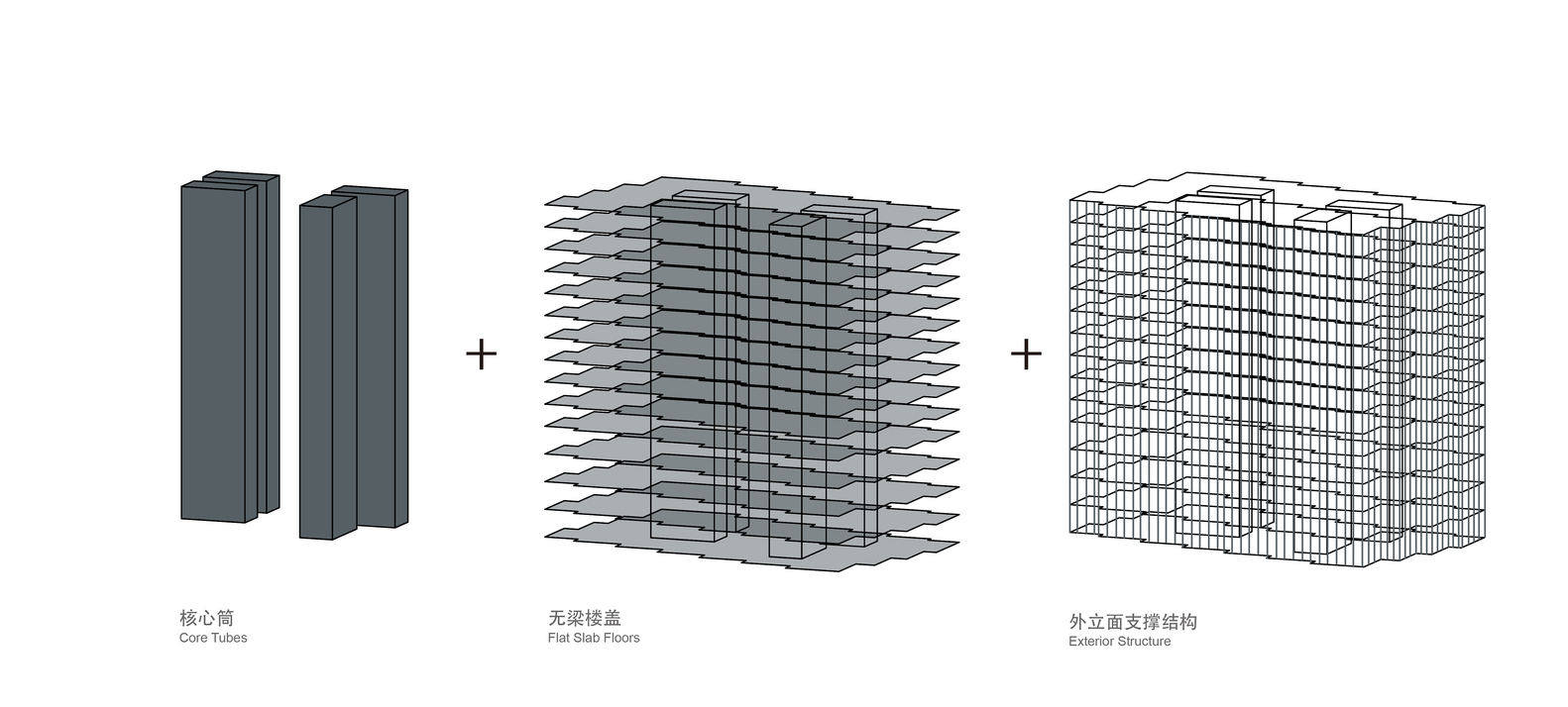The zigzag configuration offers a floor plan with multiplecorners for better views anda sense ofspatialaggregation brought by thesmaller increments. In sectional design, we devised between the cores an atriumthat penetrates all floorsand spanned by footbridges so thebuilding'sdramatic verticality can be experienced from within.