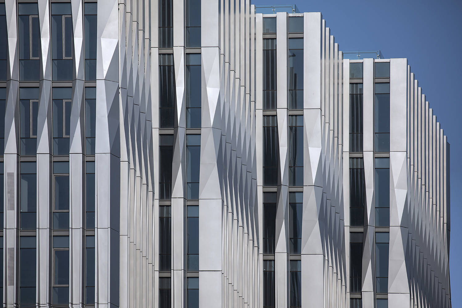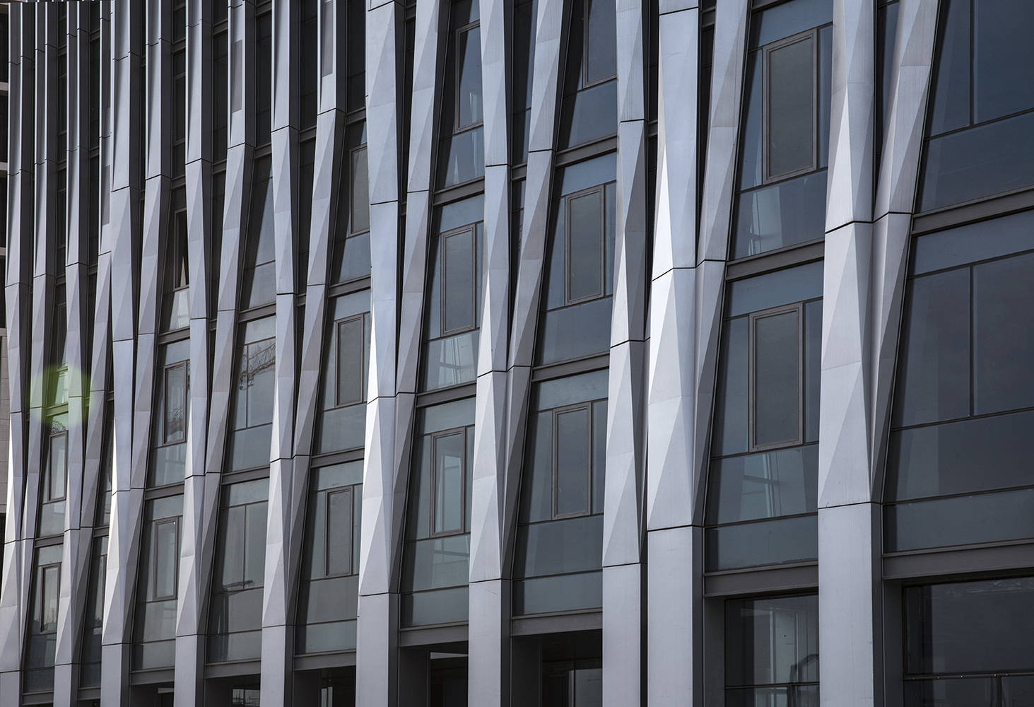 承重和自然通风的外围柱交替放置在建筑围护结构外,加强了体量的垂直组成。相邻的柱子随着高度的下降而扭曲和会聚,以便在较低的楼层进行更好的室内外互动。