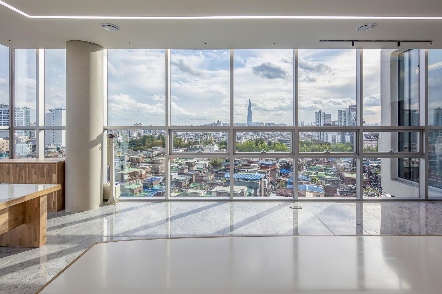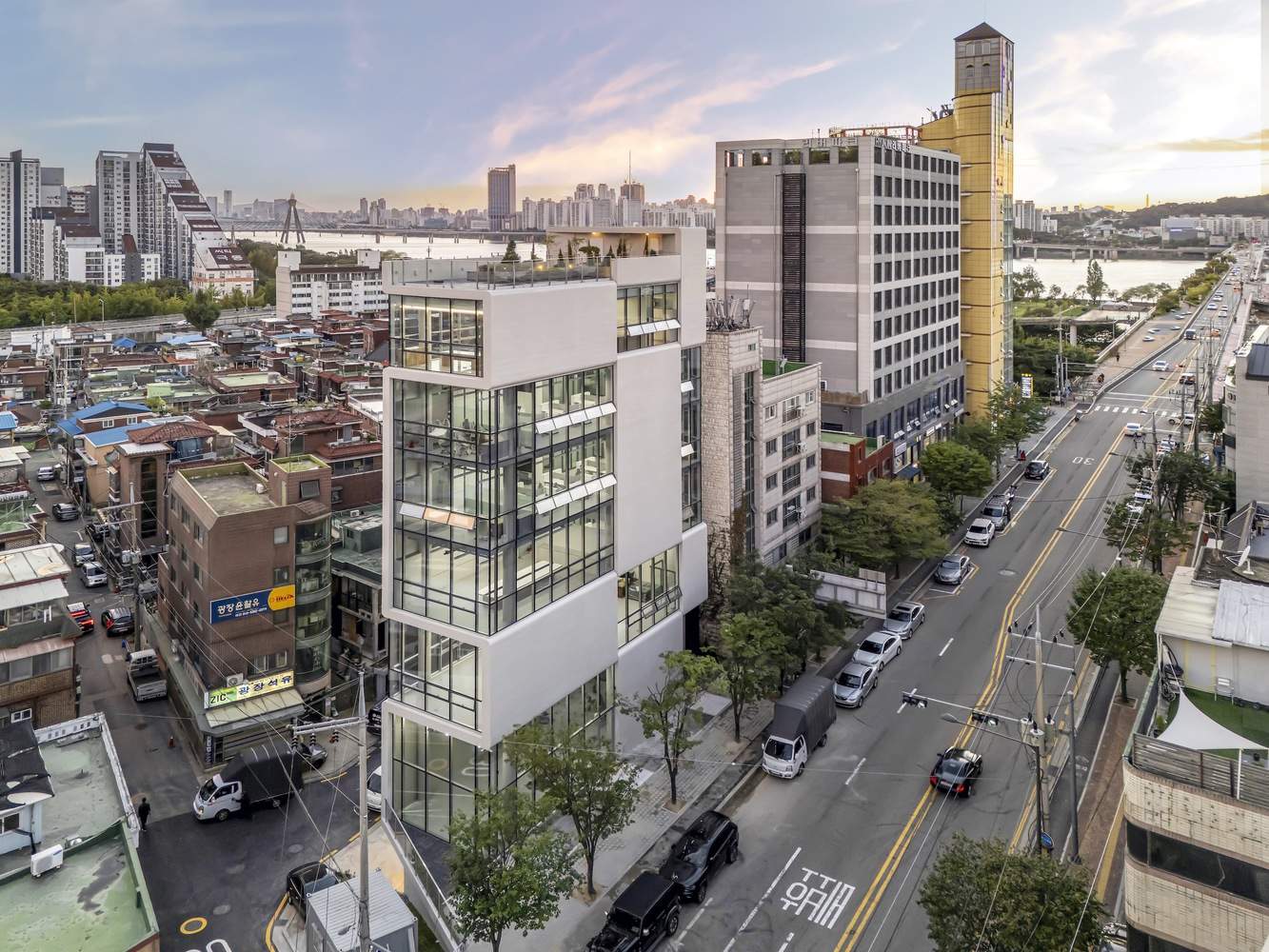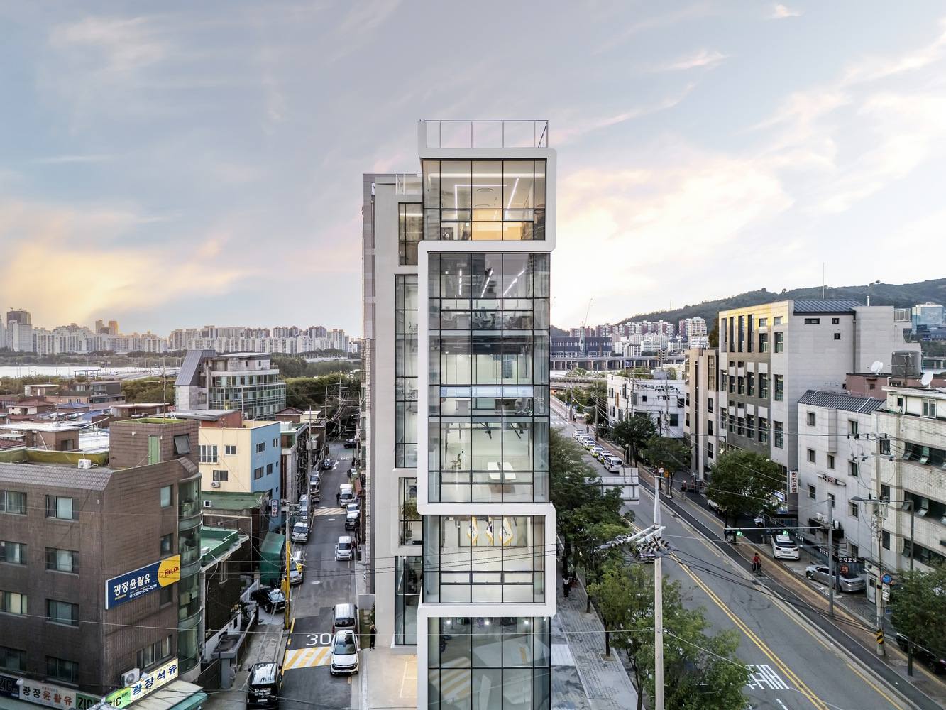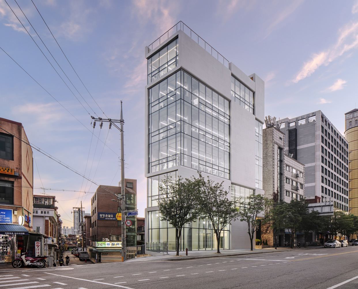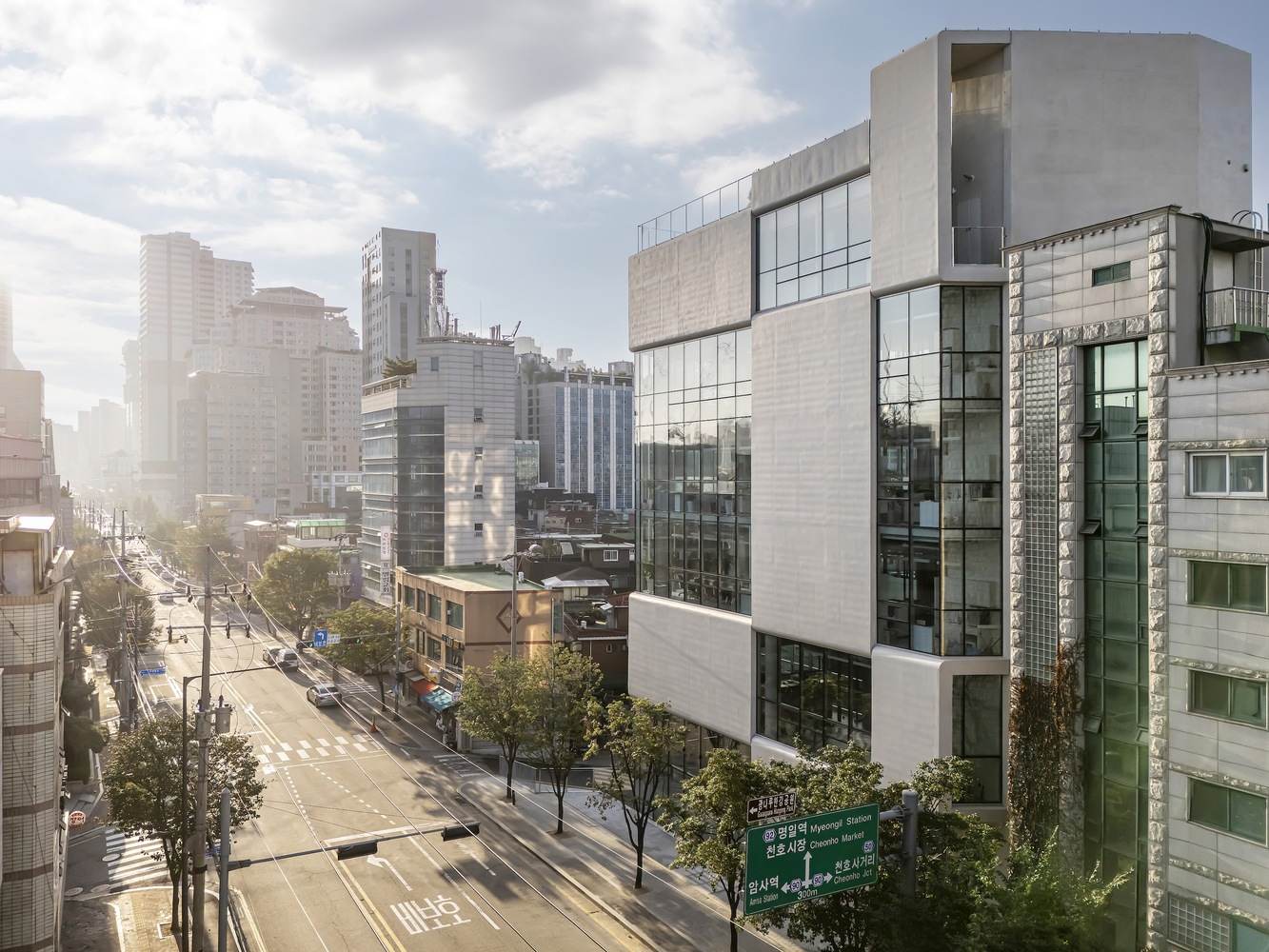 Text description provided by the architects. The site is located at the southern end of Gwangjin Bridge, on a trapezoidal plot that had long been left undeveloped. The road in front, known as "Cheonho-dong Tool Street," is somewhat bustling, but once the building is completed, it will offer a picturesque view of the Han River framed by Achasan Mountain. The front and rear roads, with a 3.6-meter elevation difference, allow for easy underground parking without additional excavation. The client decided to build an office on this site, aiming to minimize construction costs and time by utilizing the existing terrain for a quick move-in. Due to the nature of neighborhood commercial facilities, the floor plan was significantly influenced by regulations and economic factors, requiring careful consideration of the façade and material expression.