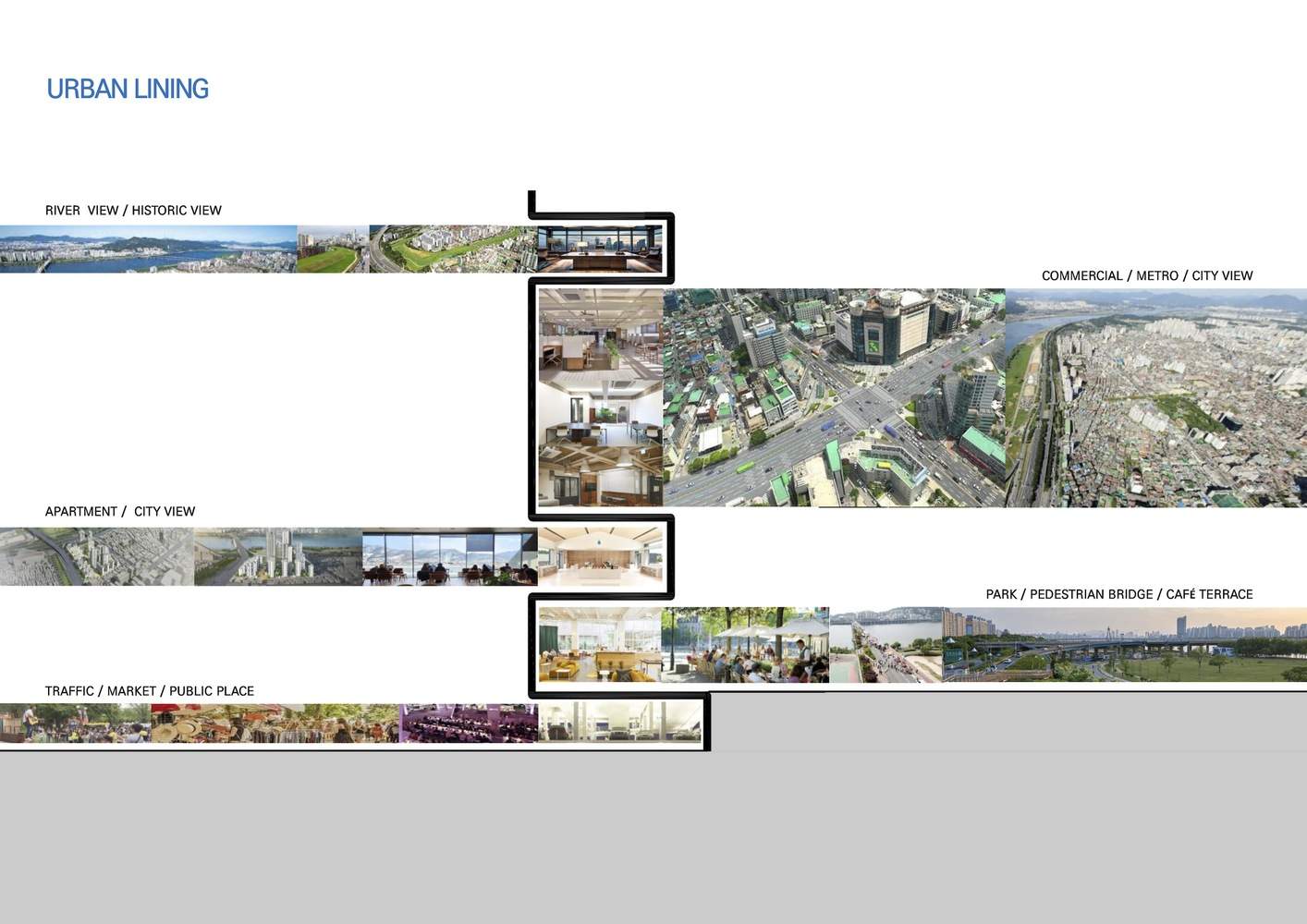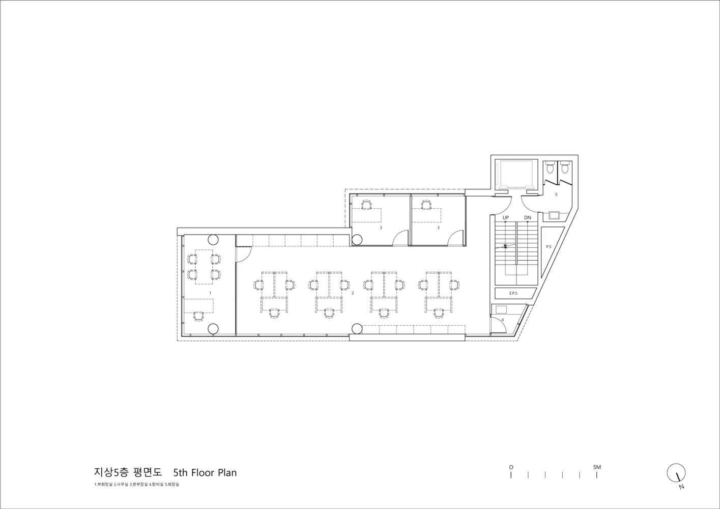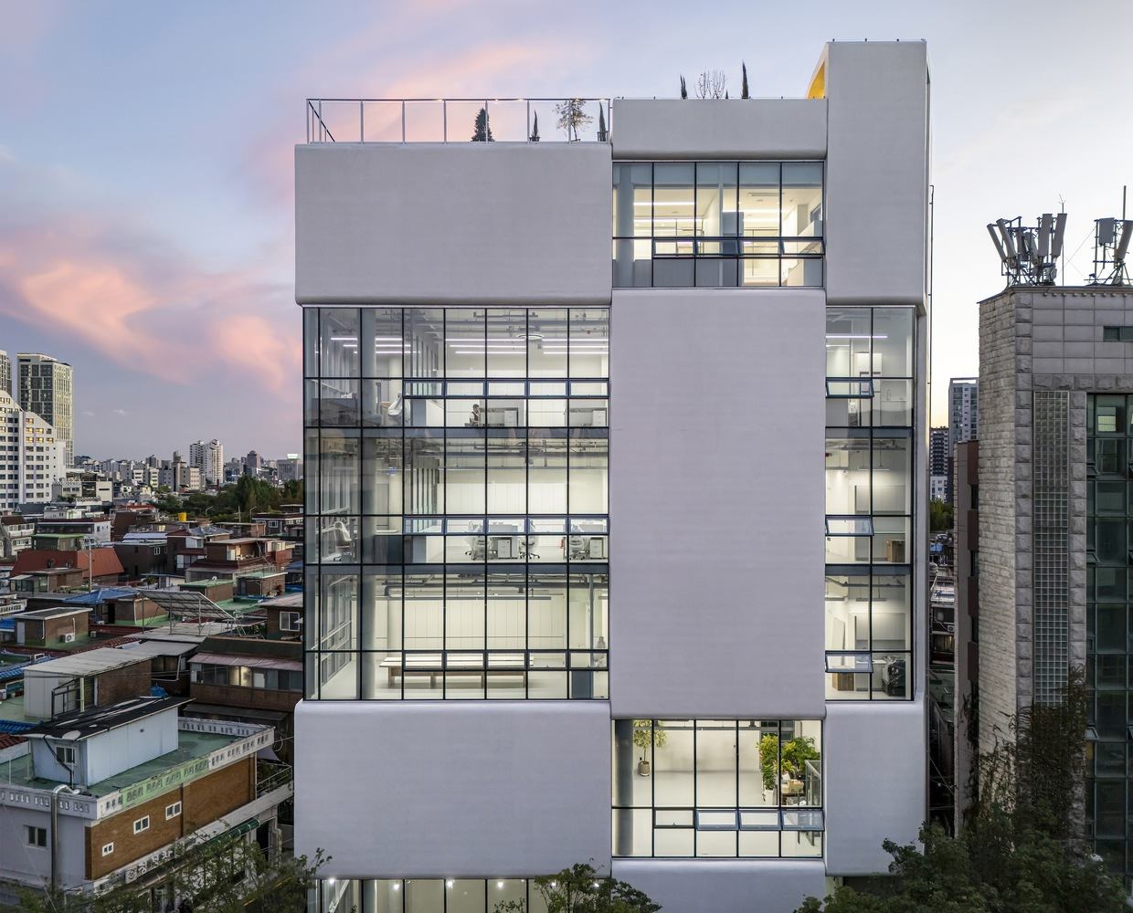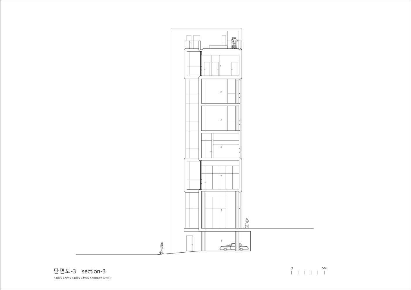 建筑师提供的文本描述如下:该场地位于光进桥南端,一个长期未开发的梯形地块上。前面的道路被称为“天湖洞工具街”,虽然有些繁忙,但一旦建筑完成,它将提供一个由阿查山环绕的汉江的如画景观。前后道路之间有3.6米的高差,这使得无需额外挖掘即可轻松建造地下停车场。客户决定在这块地上建造一个办公室,目的是通过利用现有地形来最小化建设成本和时间,以便快速入驻。由于邻近商业设施的性质,平面图在很大程度上受到法规和经济因素的影响,需要仔细考虑立面和材料表现。