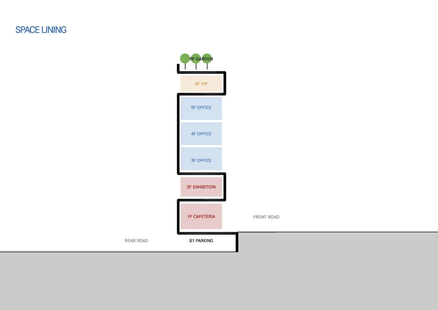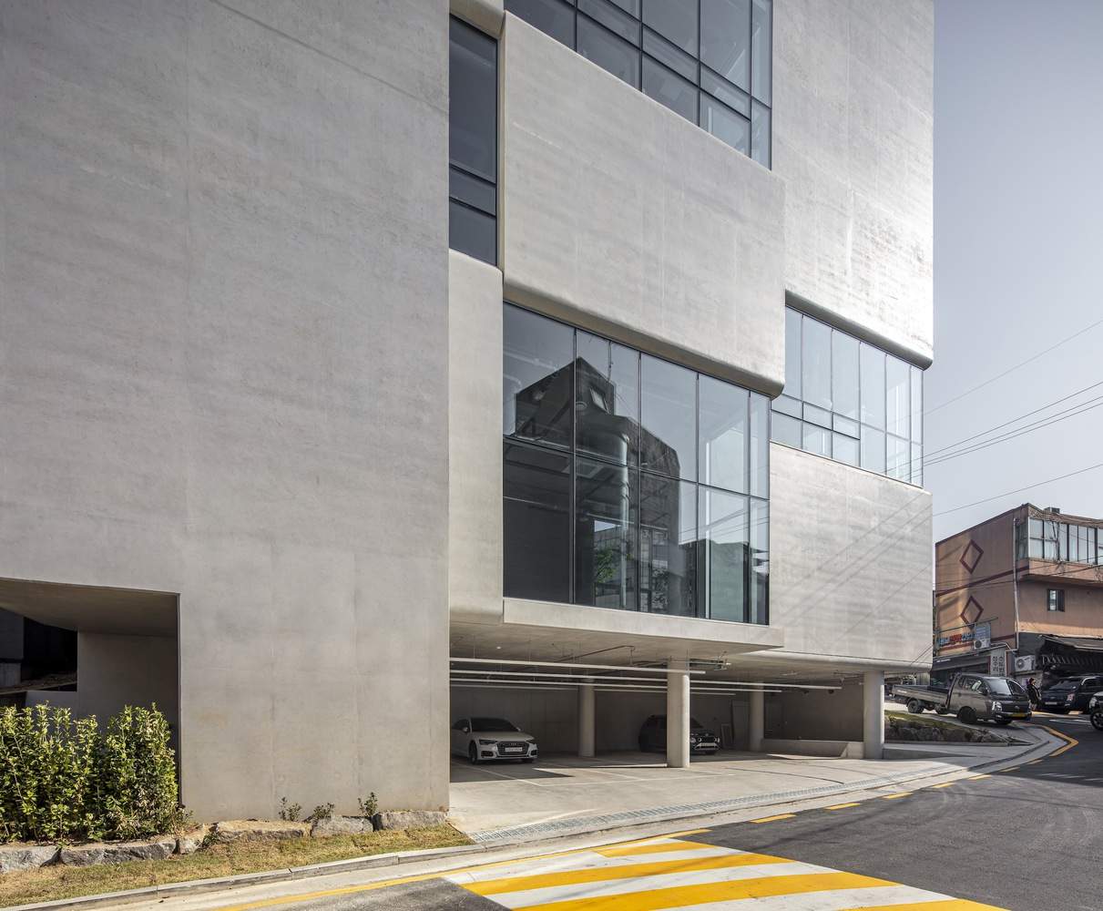 The basement level accommodates parking accessible from the rear road, the first floor features a café accessible from the main street, the second floor serves as an exhibition space, and the third to sixth floors contain office and meeting spaces. The concrete lining naturally adjusts to orientation, views, and sunlight according to the varying uses on each floor. In areas where the building's shape alters the floor width, simply reversing the direction of the lining creates diversity in both internal space and façade. Although this concept is straightforward, various technical methods such as flat slab structures, post-tensioning techniques, gang form walls, steel & reinforced concrete columns, and exposed concrete finishes were utilized in its realization. The interior spaces were designed to expose various facilities and lighting on the ceiling, aligning with the architectural concept.