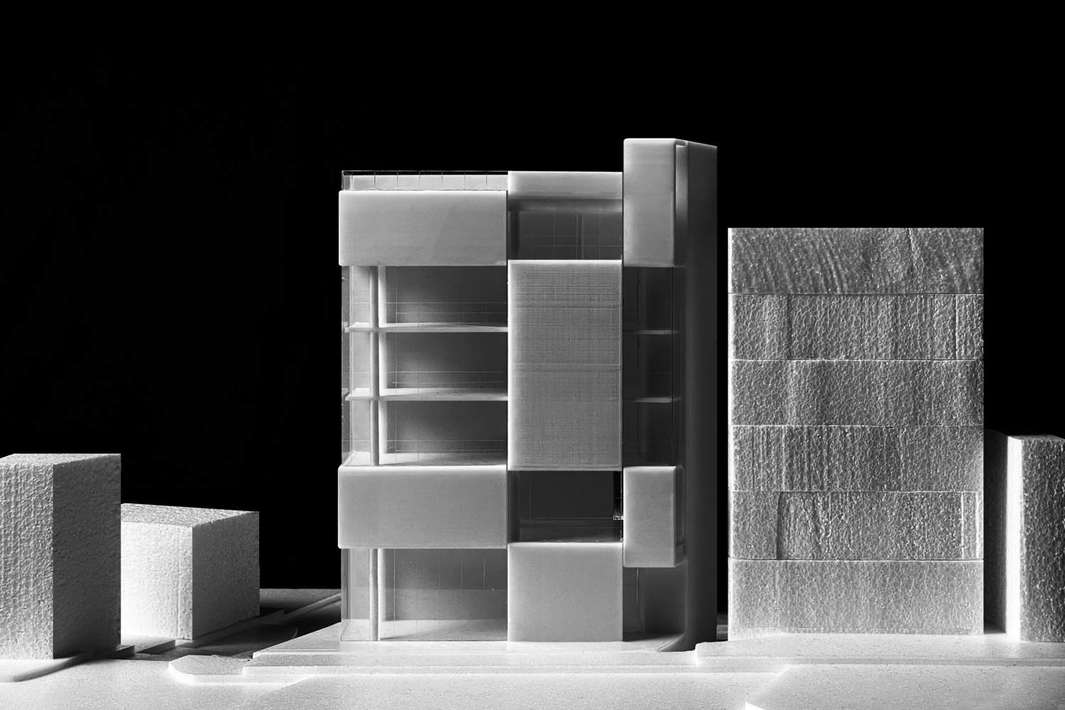 地下一层设有可从后门进入的停车场,一楼设有可从主街进入的咖啡馆,二楼用作展览空间,三至六楼设有办公和会议空间。混凝土衬里会根据每层楼的不同用途自然地调整方向、视野和阳光。在建筑物的形状改变了地板宽度的区域,简单地反转衬里的方向就可以在内部空间和立面上创造多样性。虽然这个概念很简单,但各种技术方法,如平板结构、后张技术、组合墙、钢结构和混凝土结构,都是可行的;在其实现中利用了钢筋混凝土柱和外露混凝土饰面。室内空间的设计是为了在天花板上展示各种设施和照明,与建筑概念相一致。