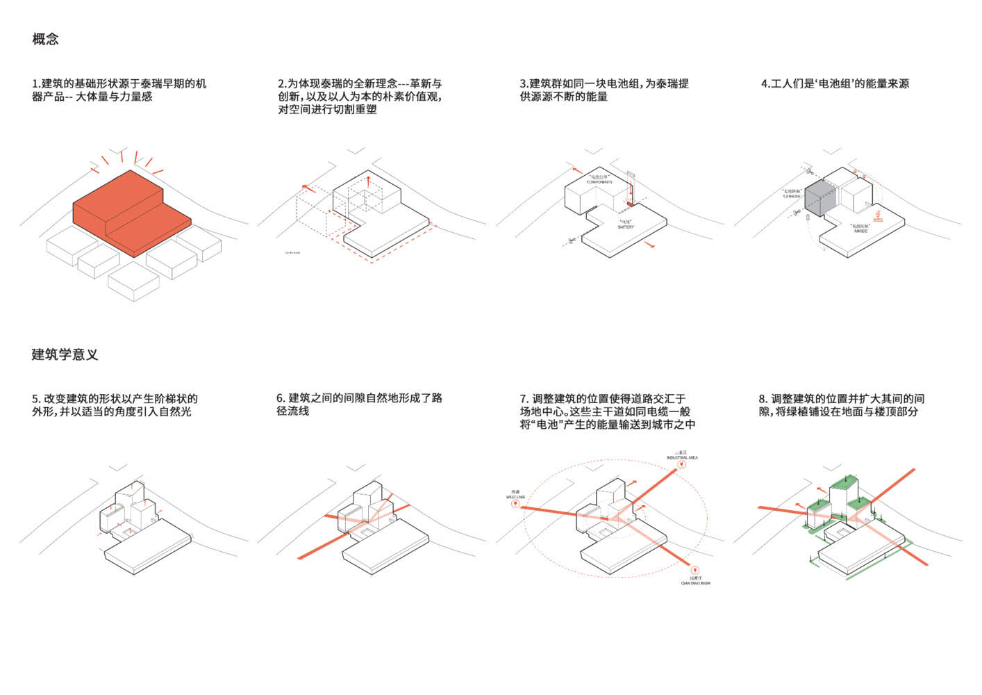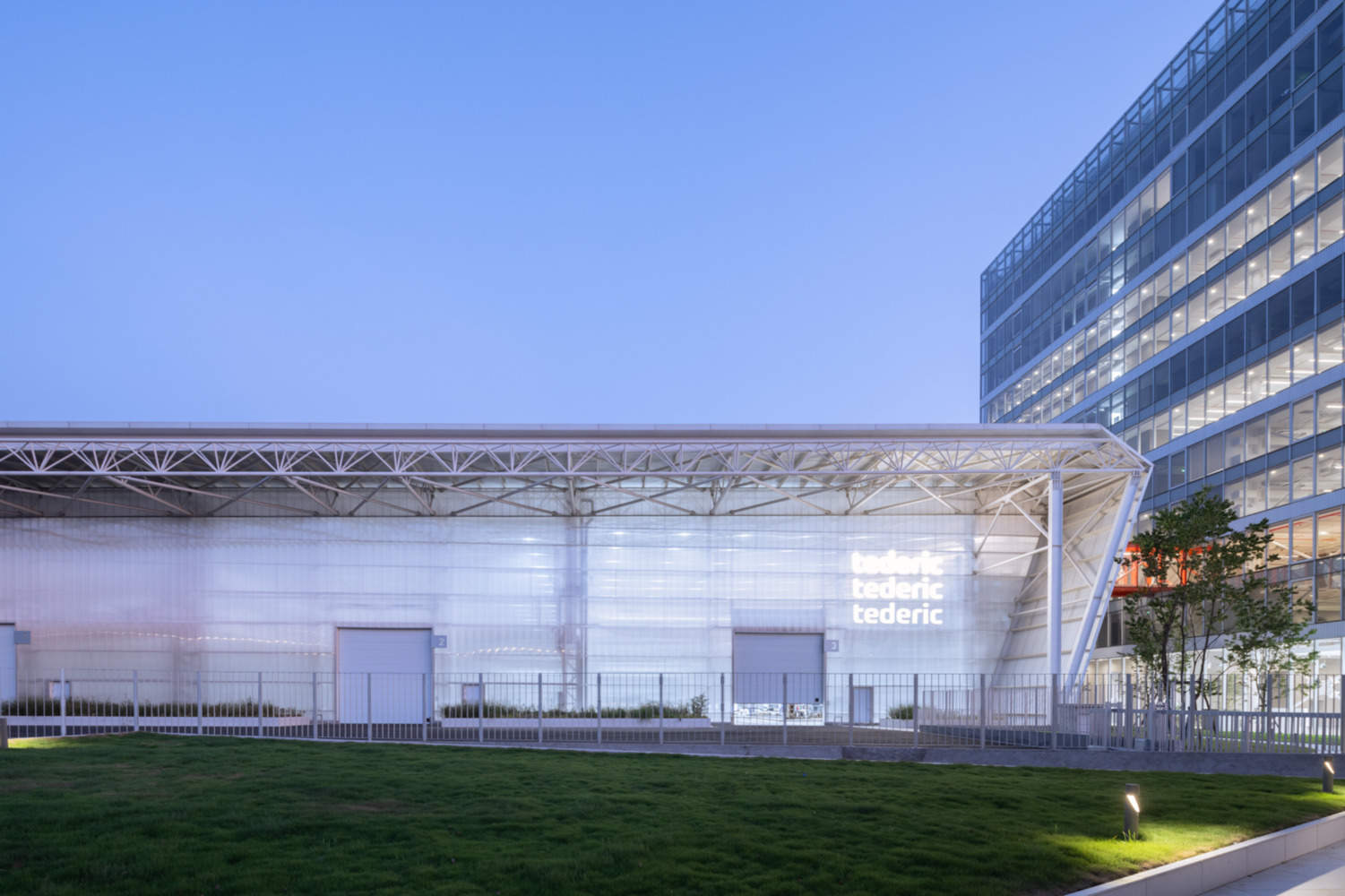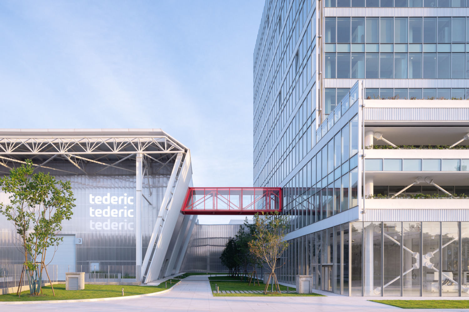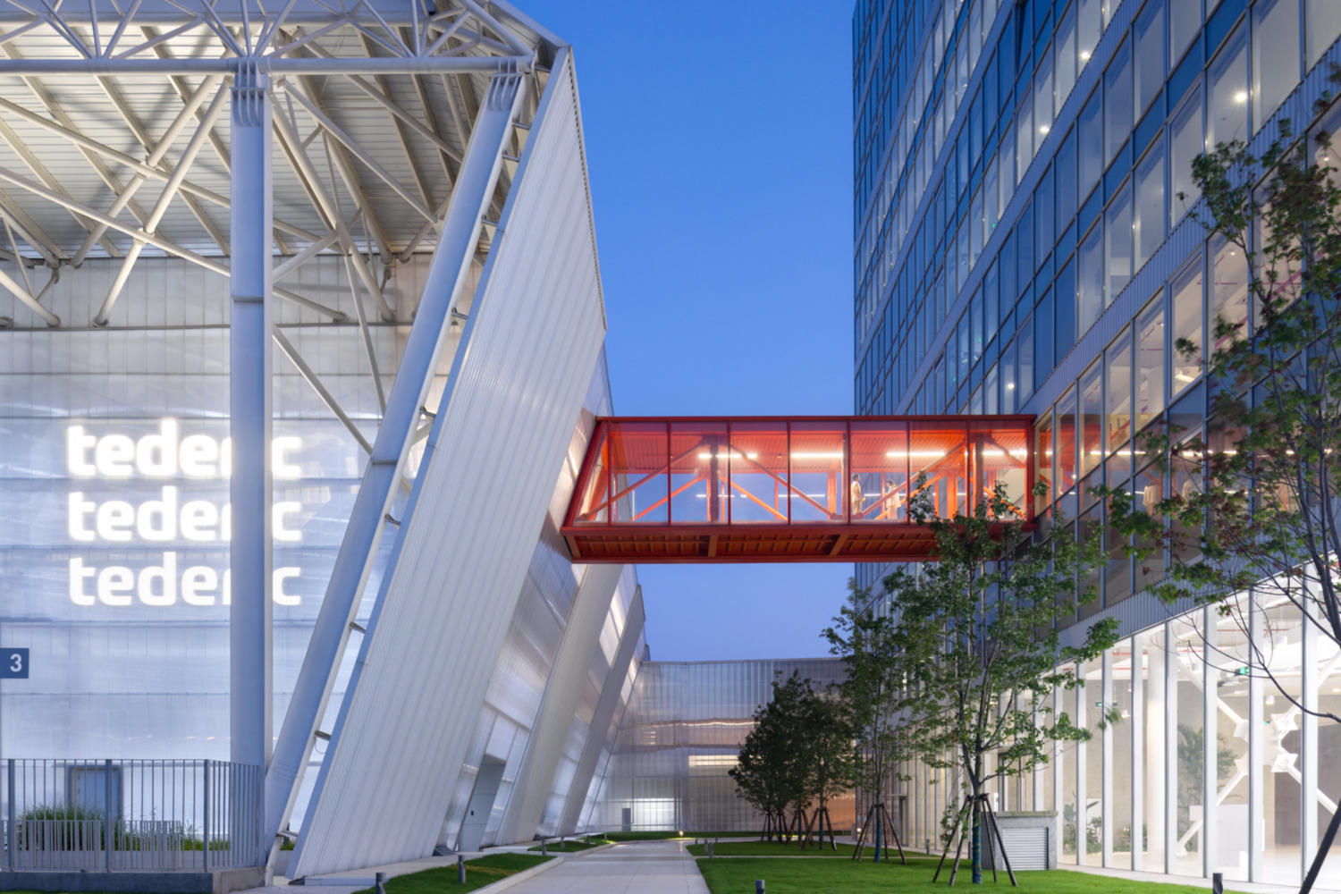 这一概念反映在建筑设计中,Tederic的总部通过红桥与智能工厂相连,象征着能量的持续流动。工厂的形式和光影的相互作用就像一个电池,为制造系统的永久运行提供动力。