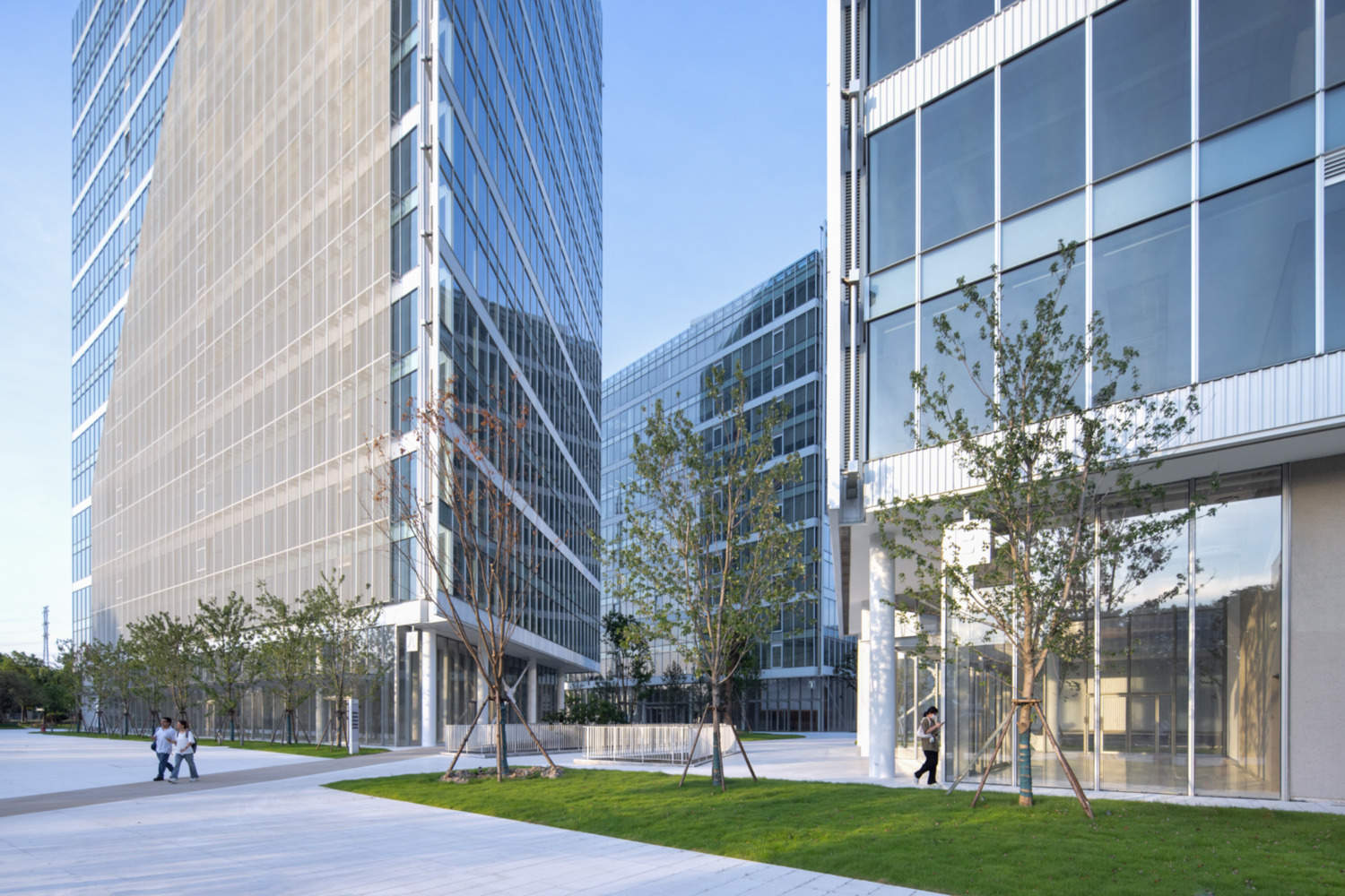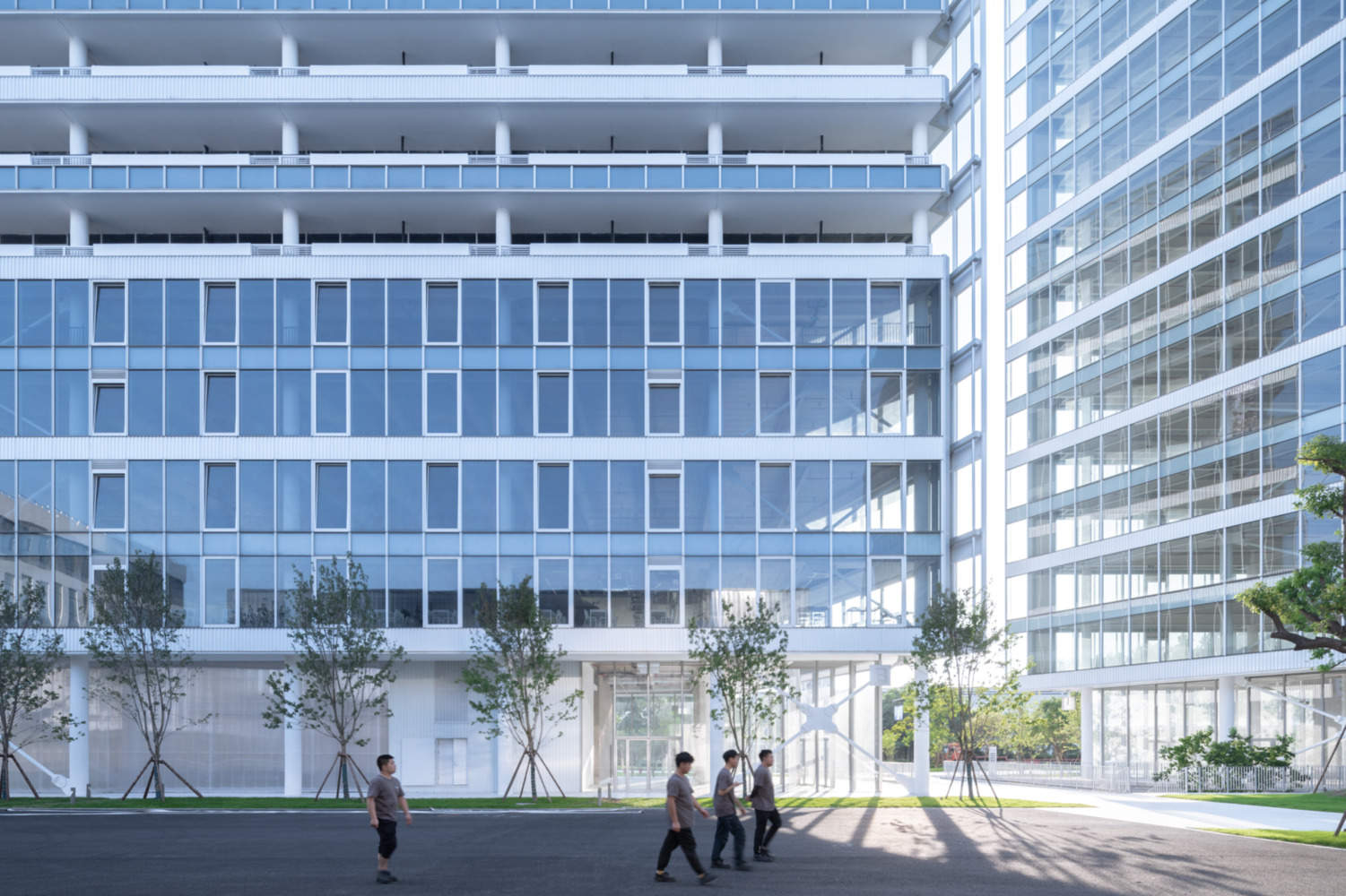- Glass curtain wall - The Low-E coated laminated glass effectively blocks infrared and ultraviolet rays, ensuring excellent thermal performance. In addition, after multiple rounds of sampling, simulation, and testing, the project ultimately selected 12 types of glass to account for varying light conditions on different facades. This approach not only ensures a consistent reflective visual effect across the entire campus but also helps the client control and reduce costs to the greatest extent possible.