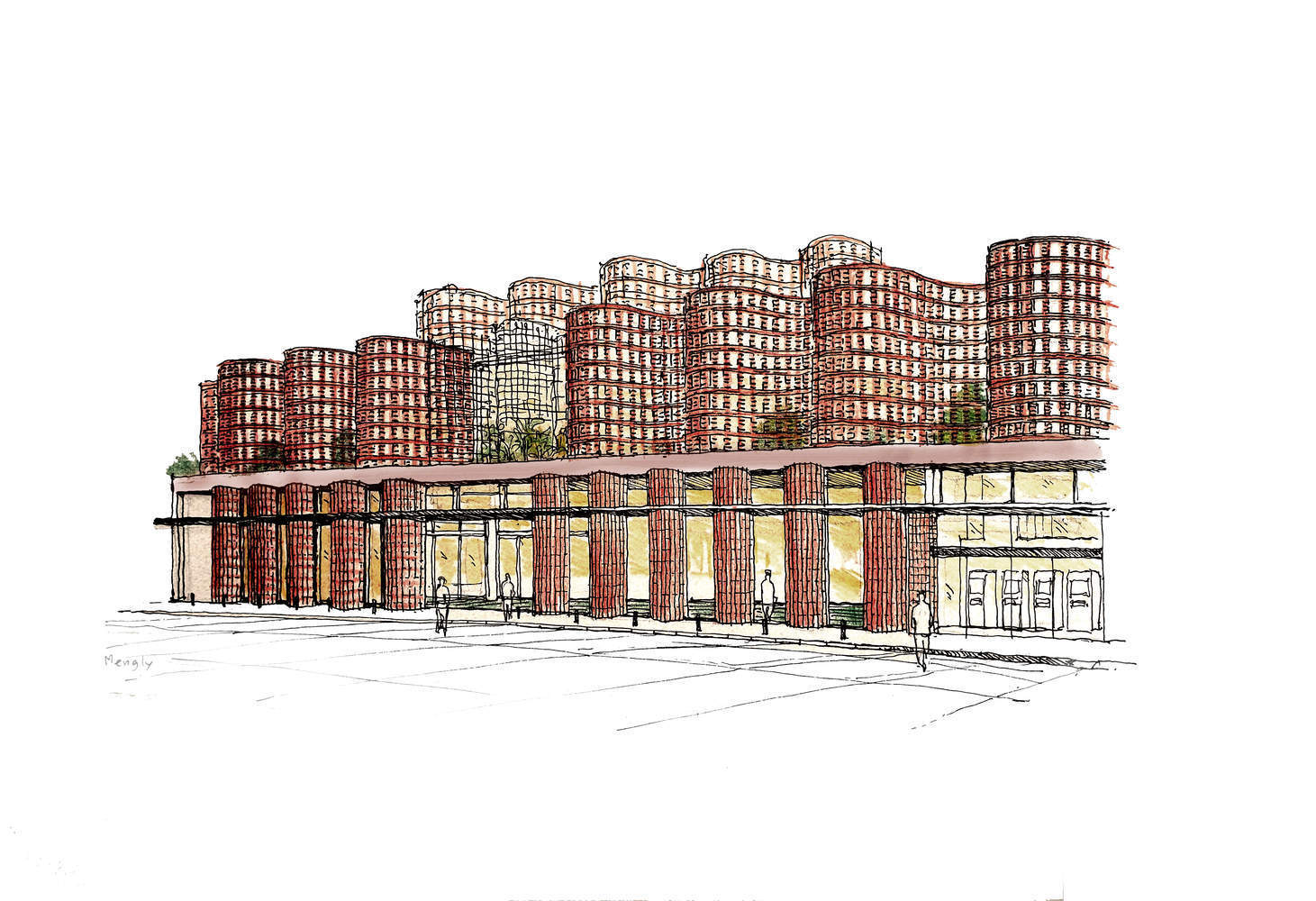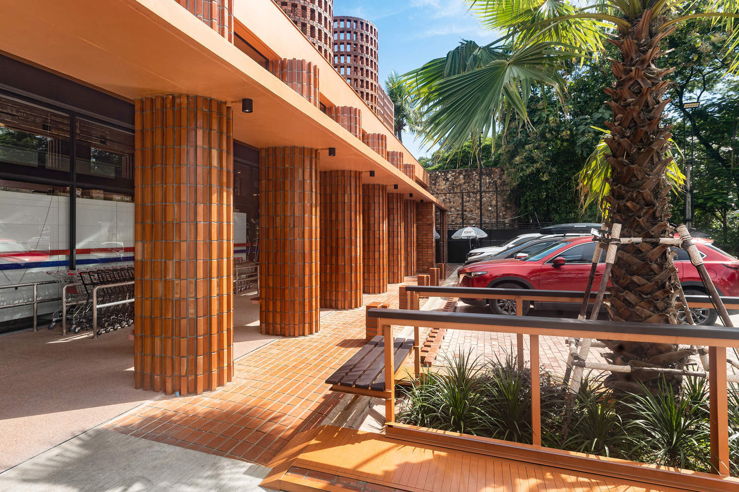 The exposed brick façade creates a timeless, earthy, and natural appearance to enhance the surrounding architectural character. From a structural point of view, the stability of brick walls is solely dependent on their wavy shape and brick bonding. Palm trees are positioned at street level, creating a visual link with the brick façade. At ground level, A large entrance space, with higher ceilings as you move in, is covered in delicately patterned shadows created by the gentle natural light that filters through the latticework and tropical garden.