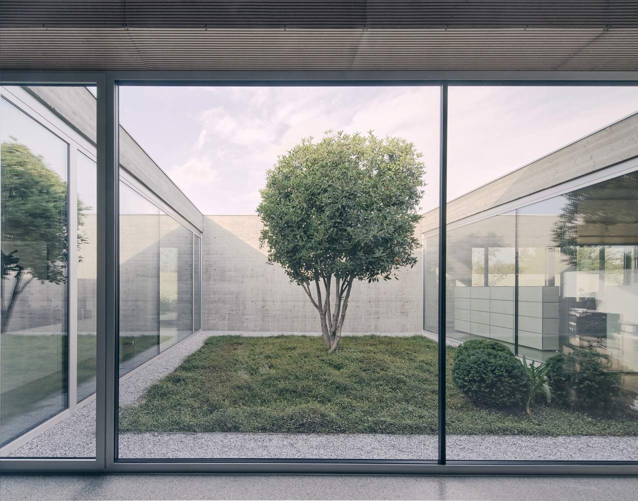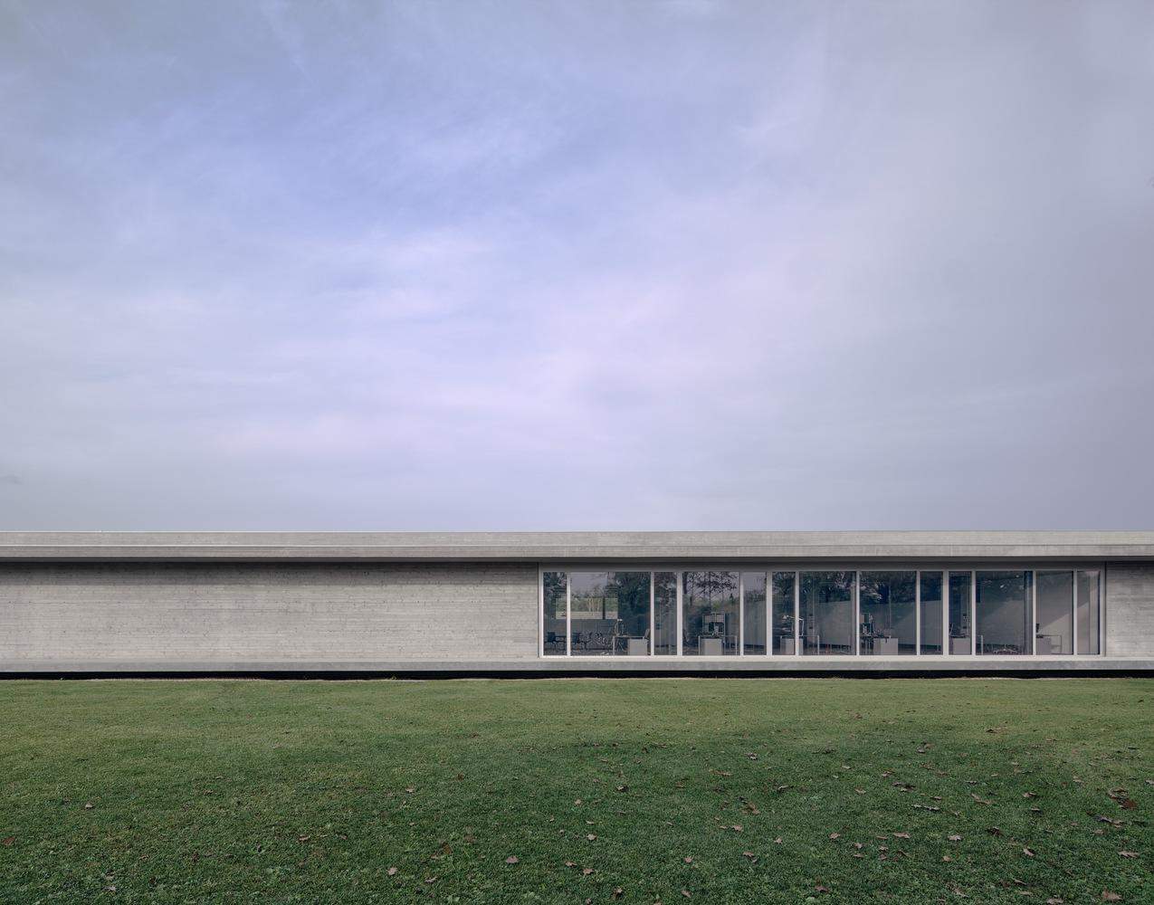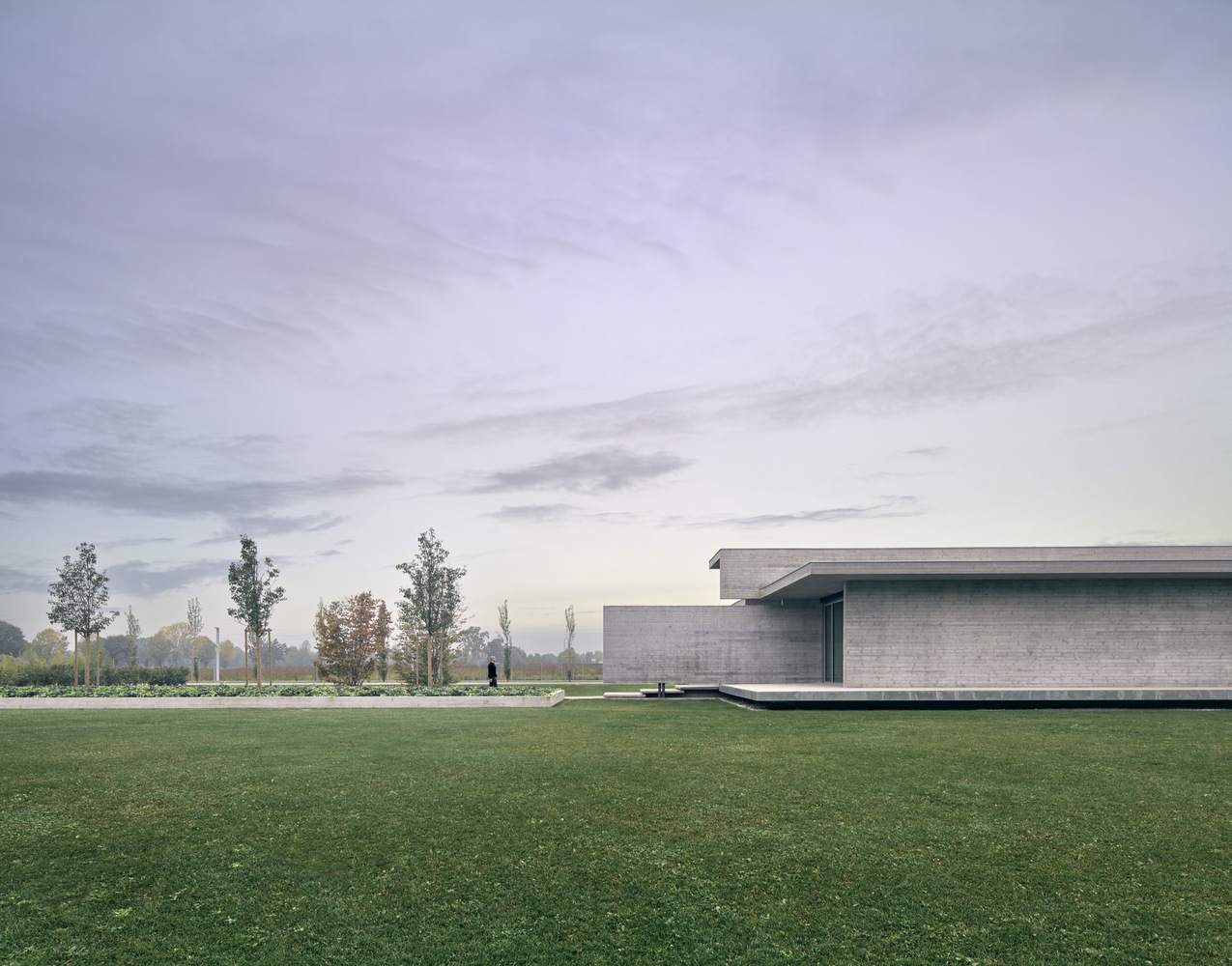 Architecture figuratively takes up the plot of the landscape and with its essential language, it appears as an object suspended on the grassy expanse, in balance with the garden. The tension between the rippling of the orographic components and the rigidity of the concrete volume is concentrated in the shadow that the architectural object produces by interfacing with the countryside.