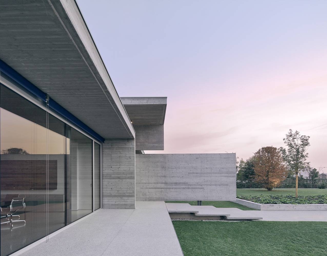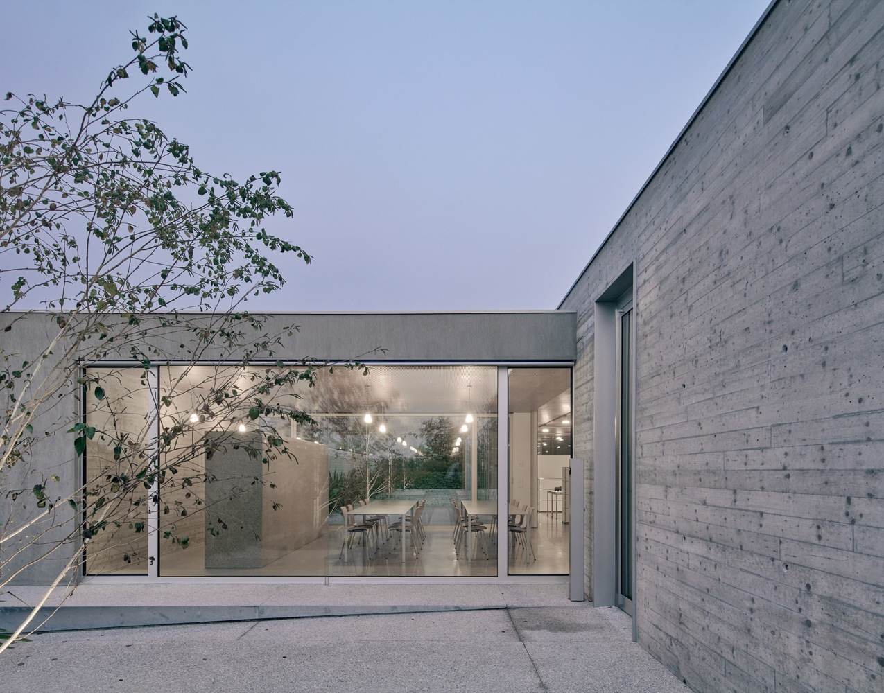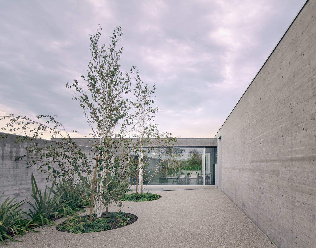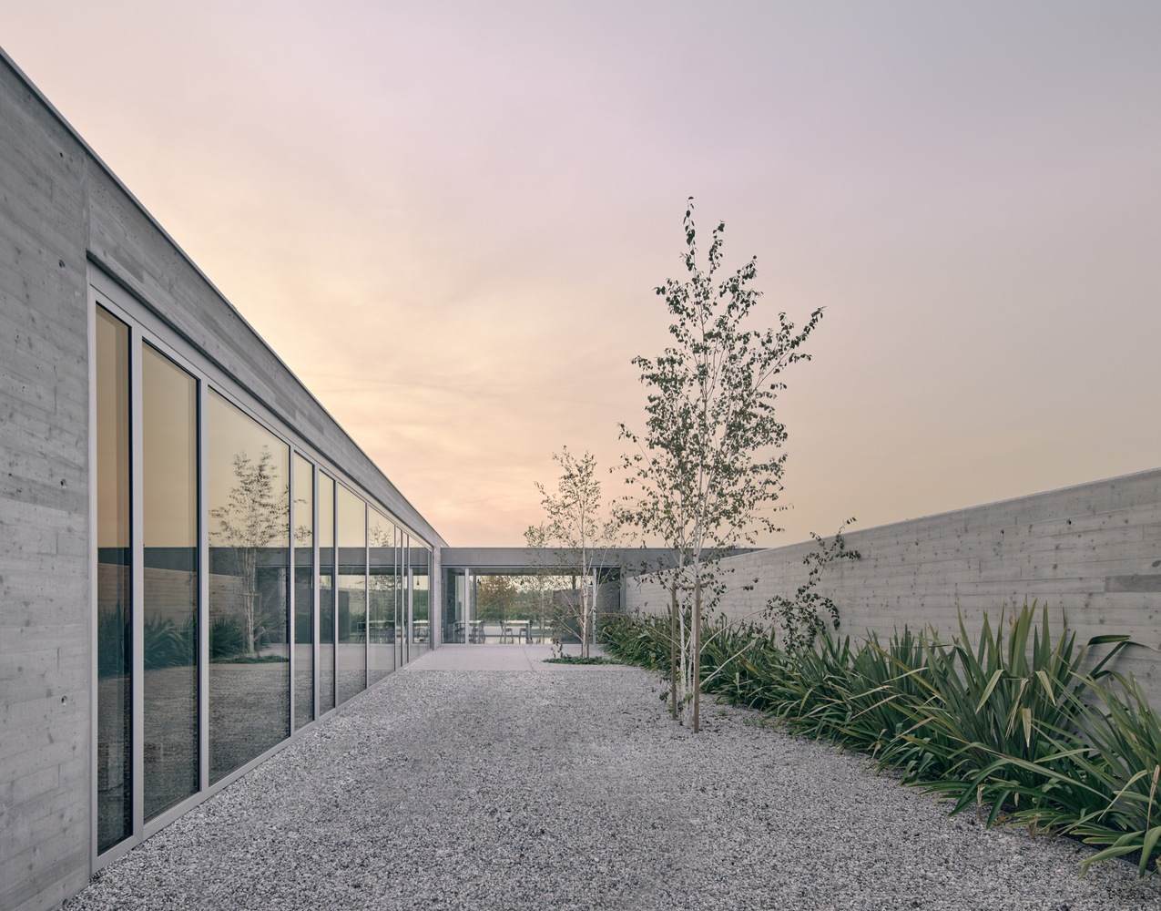 Architecture figuratively takes up the plot of the landscape and with its essential language, it appears as an object suspended on the grassy expanse, in balance with the garden. The tension between the rippling of the orographic components and the rigidity of the concrete volume is concentrated in the shadow that the architectural object produces by interfacing with the countryside.