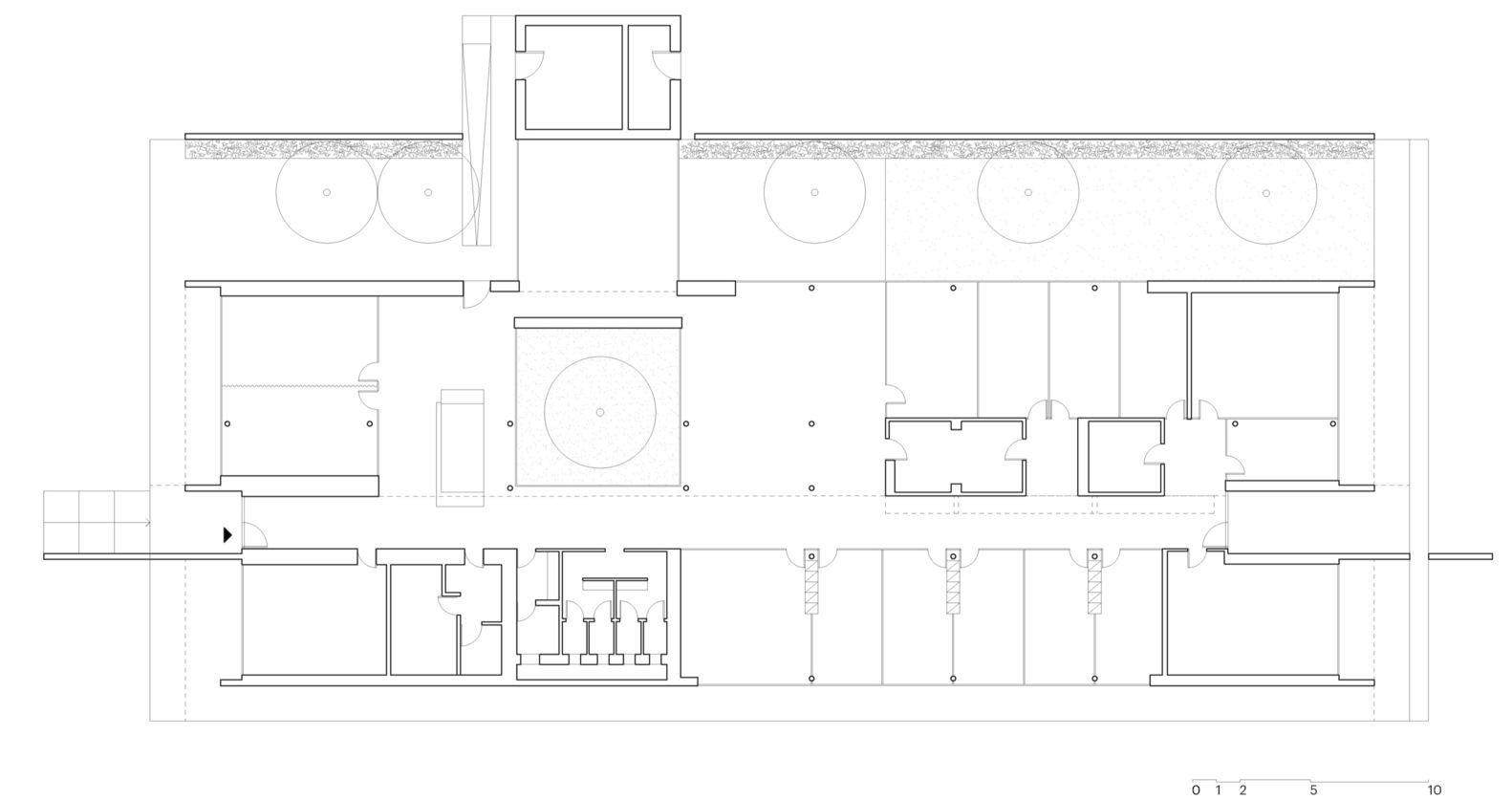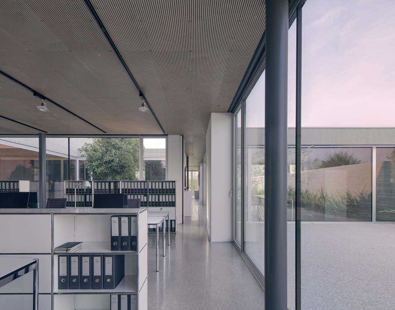 The planimetric composition arises from parallel yet staggered exposed concrete partitions, reinterpreting the texture of the cultivated fields. Their modularity recalls the pitch of the vine rows that previously occupied the project site. This articulation of the space into parallel strips is also clearly legible in the facades, through the difference in height concerning the central distribution route.