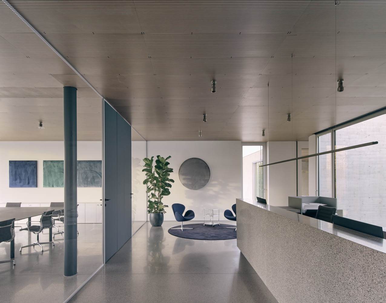 The workspaces develop along this axis, at the head of which is the entrance, enhanced by an out-of-scale steel portal and a suspended concrete wall. A second axis, orthogonal to the first, separates the public front of the building from the operational area: the reception and meeting rooms are located in the first part, offices, and open space in the second. The filter band, marked in the layout by the extroversion of the technical volume towards the north, houses the restrooms and utility rooms, a relaxation area with a kitchen, and a patio.