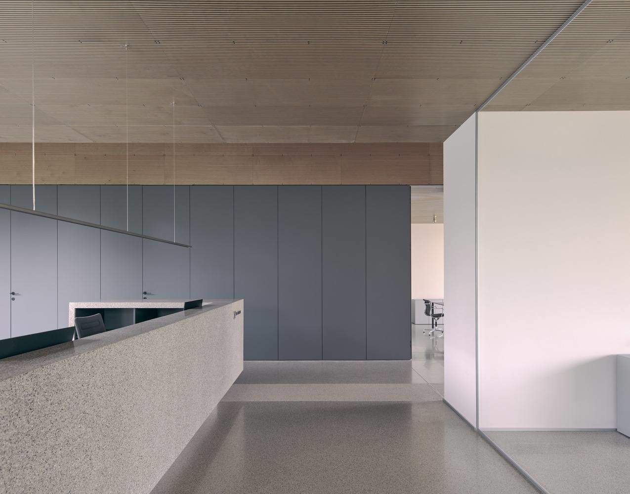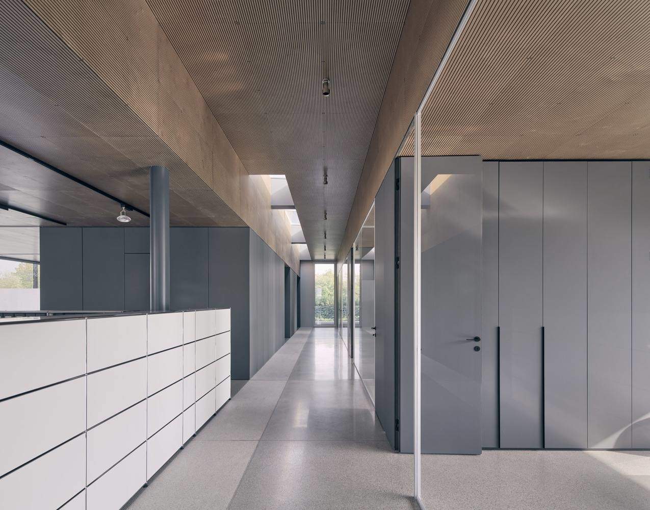 工作空间沿着这条轴线发展,其顶部是入口,由一个超大的钢门和一堵悬挂的混凝土墙加强。与第一条轴线正交的第二条轴线将建筑的公共正面与运营区域隔开:接待室和会议室位于第一部分,办公室和开放空间位于第二部分。过滤带在布局中以技术卷向北向外延伸为标志,包括卫生间和杂物间、带厨房的休闲区和露台。