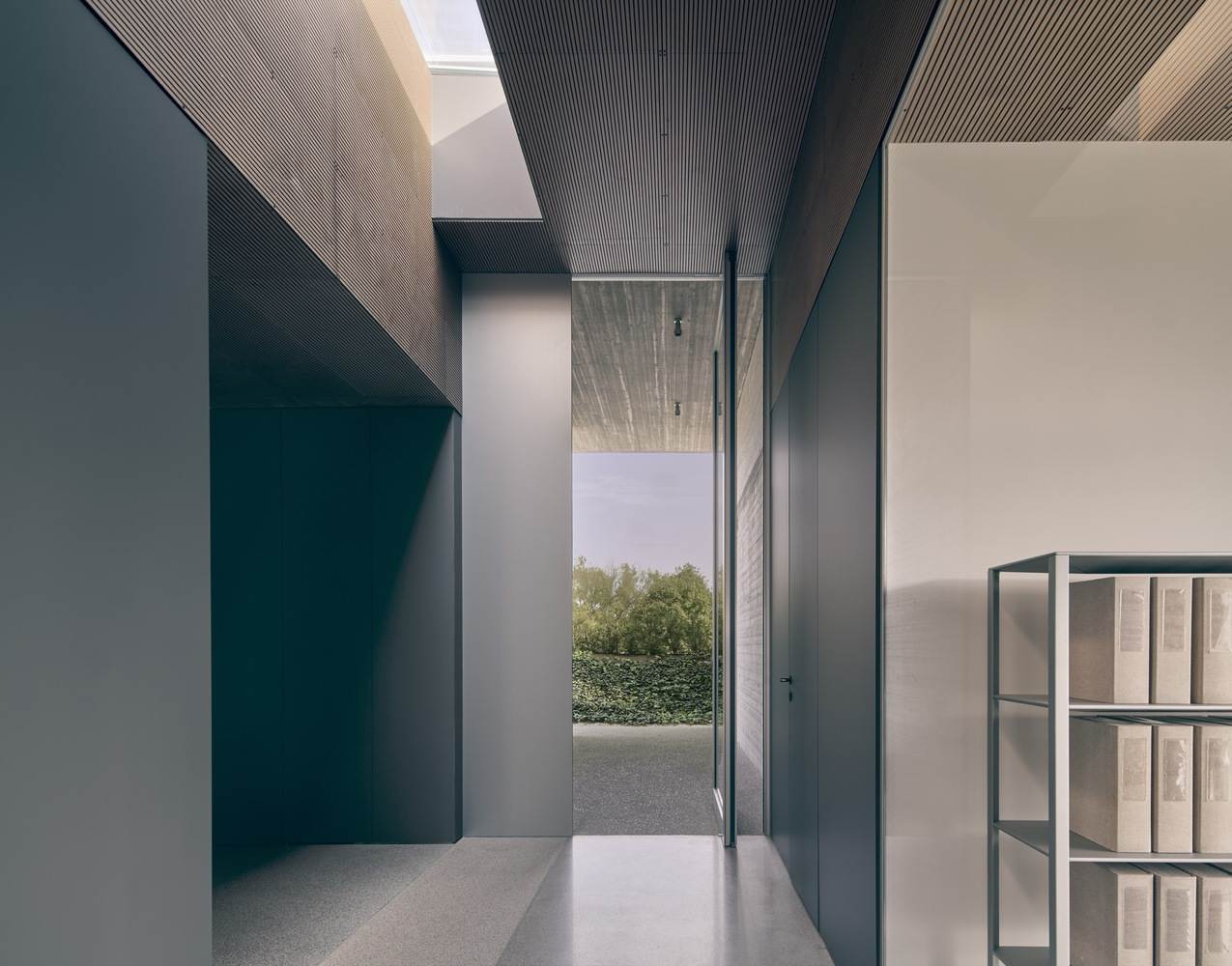 The floors are treated with a smoothed cement conglomerate with exposed aggregates. The long perspective of the distribution path is enhanced by a bush-hammered walkway which at one end refers to the light that is cut off by the roof. The concrete was also reintroduced in the entrance counter and the external flooring, dialogues with the wooden slatted ceiling, the anthracite grey lacquered boiserie, and steel windows. The technological choices, from the photovoltaic system to the recovery of rainwater for irrigation, are oriented toward sustainable use of resources.