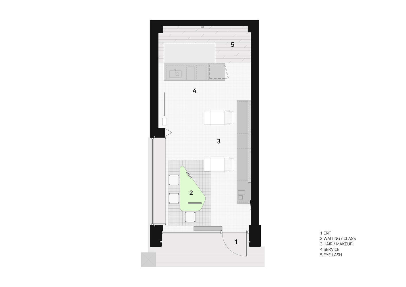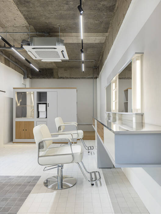 内部以每项服务所需的家具和空间为特色,背景为白色调。该空间分为三个主要服务区:等候和上课区、头发和化妆区以及睫毛护理区。每个服务区的墙壁和地板都以灰色作为家具的背景,桌子、梳妆台和橱柜等形式的家具都是为了适应每个空间的功能而设计的。