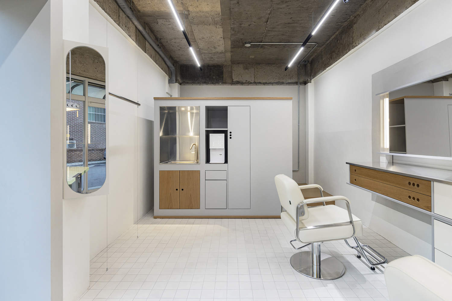 The cabinet placed in front of the eyelash treatment area at the back serves multiple purposes. It provides a sink for preparing drinks for customers and cleaning tools, and storage space, while simultaneously acting as a partition that naturally separates the hair and makeup area from the eyelash treatment area.We hope that each customer who comes for a special day will enjoy their personalized service along with diverse spatial experiences both inside and outside this small space.