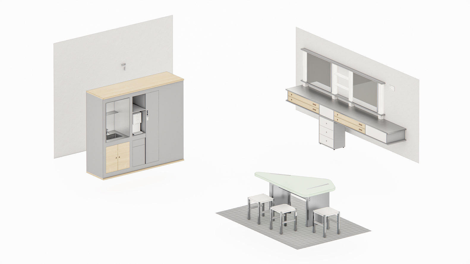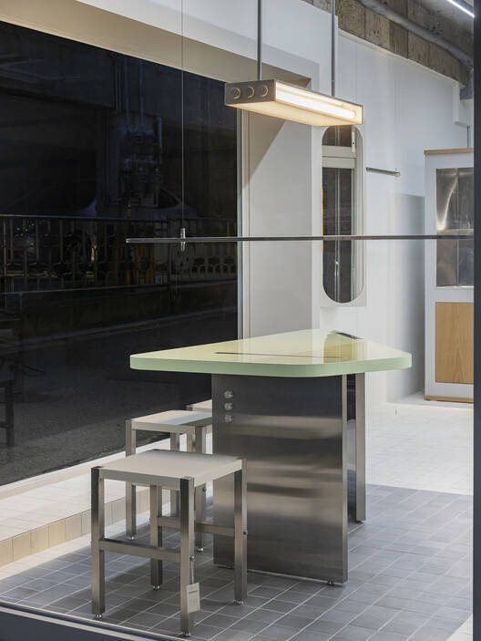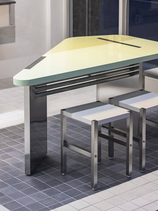 等候和上课区的桌子设计有三角形的顶部和倾斜的腿,以其独特的形状、未成熟的柠檬色和光滑的表面成为立面上的一个亮点。安装在上方的吊灯进一步强调了这个空间的白色小谎言。头发和化妆区的梳妆台包括一个柜台和两个镜子,但通过在顶部和底部使用长水平线,它被设计成看起来像一件大型家具。不锈钢台面上添加了木材和半透明丙烯酸,以增加柔软感。