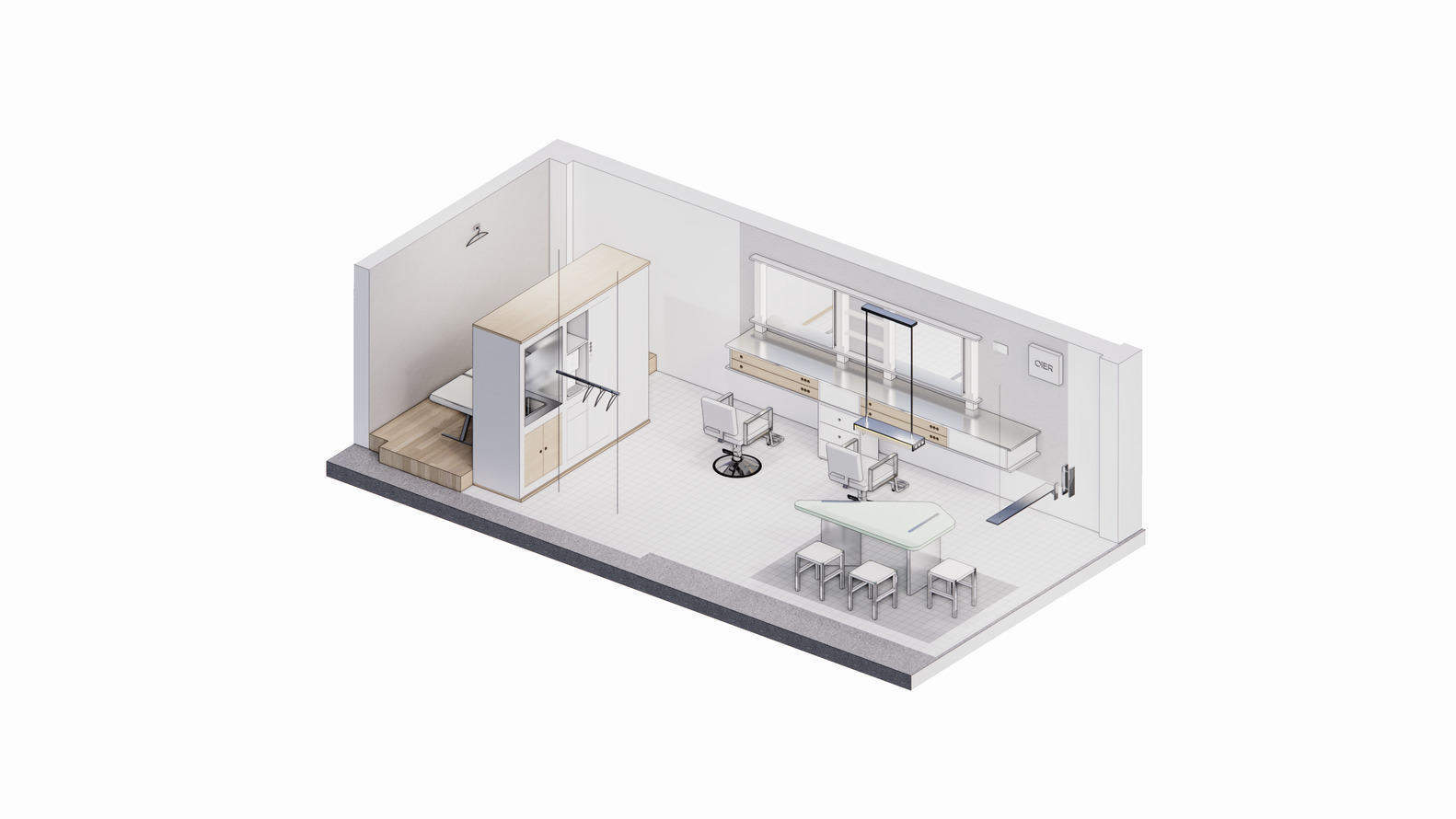放置在后部睫毛治疗区前方的橱柜具有多种用途。它提供了一个水槽,用于为顾客准备饮料和清洁工具,以及存储空间,同时作为一个隔板,自然地将头发和化妆区域与睫毛护理区域分开。我们希望每一位在特殊日子到来的客户都能享受到他们的个性化服务,以及这个小空间内外的多样化空间体验。