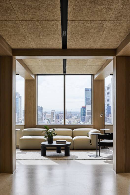 "The existing geometry of 500 Bourke presents such a strong grid within the space that we wanted to utilize to inform the planning and design language throughout. This has been achieved by cladding the existing façade columns in timber and creating a secondary structure by introducing internal timber beams and columns. The resulting articulation dictates the layout of spaces and creates a strong colonnade, providing visual clarity and grounding the interior spaces within the context of the building," shares Catherine.The recurring motif of timber is seen again on the joinery throughout the space to offset the cooler tones from the poured concrete overlay flooring. The wood wool ceiling tiles strengthen the natural and textural material palette. The concrete, timber, and wood wool combined with softer leather and textural fabrics create a welcoming and tactile environment all about comfort and authenticity. Finally, the highly refined detailing around the finishes elevates them beyond the expected.