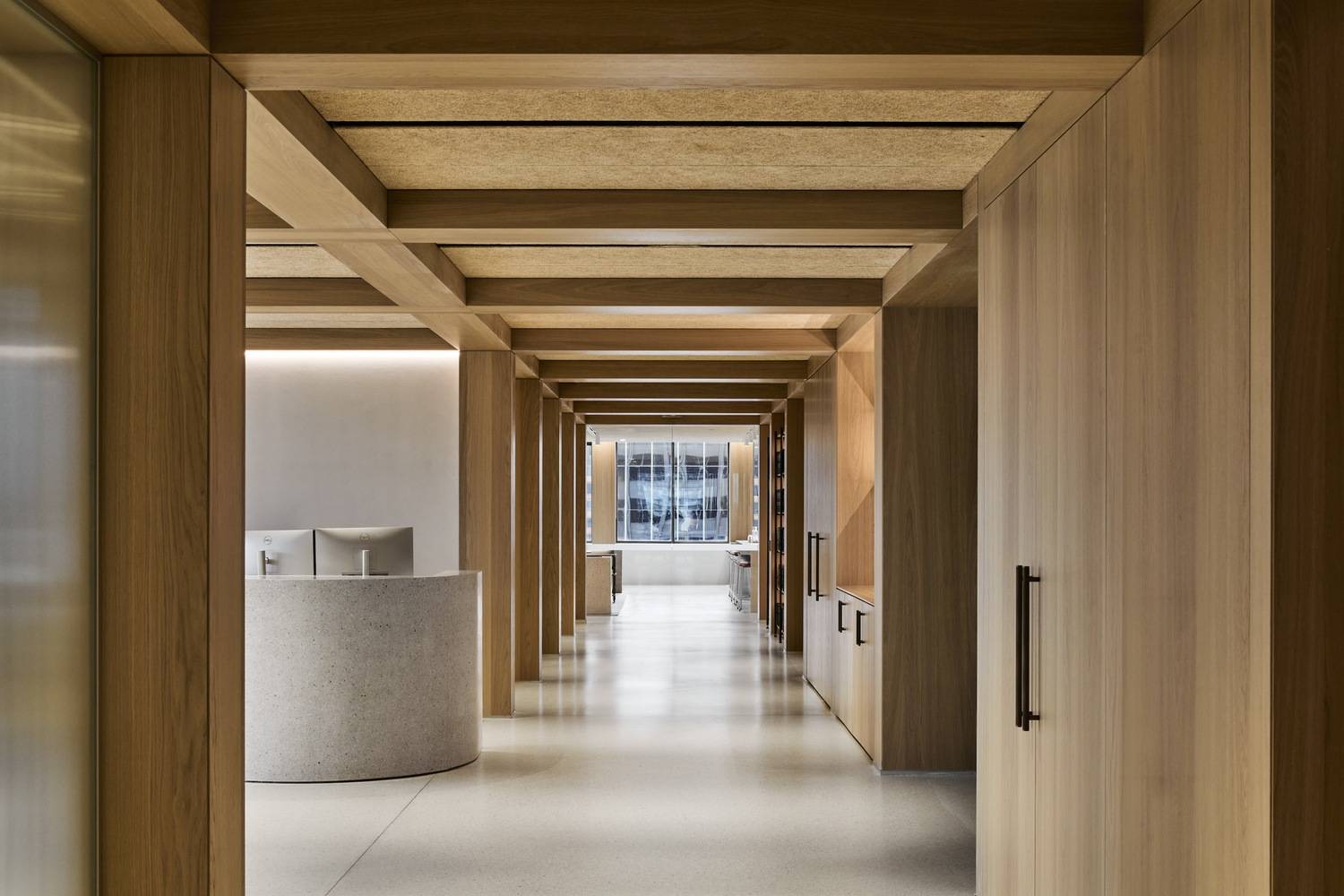 Catherine分享道:“500 Bourke的现有几何形状在空间内呈现出如此强大的网格,我们希望利用它来为整个规划和设计语言提供信息。这是通过用木材覆盖现有的立面柱,并通过引入内部木梁和柱来创建二级结构来实现的。由此产生的连接决定了空间的布局,并创造了一个强大的柱廊,提供了视觉清晰度,并将内部空间与建筑的背景联系起来。”。木材的重复主题再次出现在整个空间的细木工制品上,以抵消浇注混凝土覆盖地板的冷色调。木丝天花板瓷砖加强了自然和纹理材料的色调。混凝土、木材和木毛与柔软的皮革和纹理织物相结合,创造了一个温馨舒适的触觉环境。最后,围绕饰面的高度精致的细节使它们超出了预期。