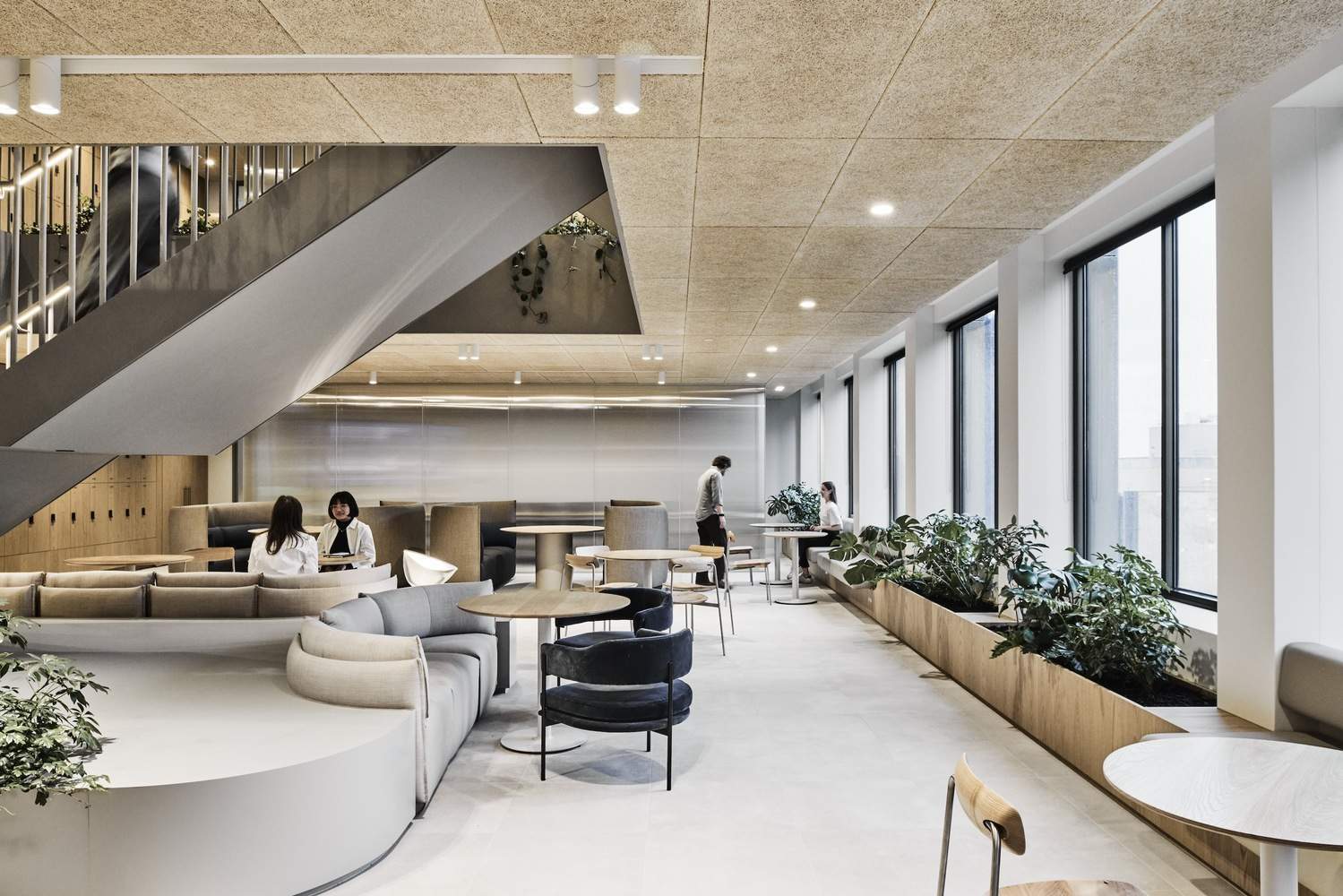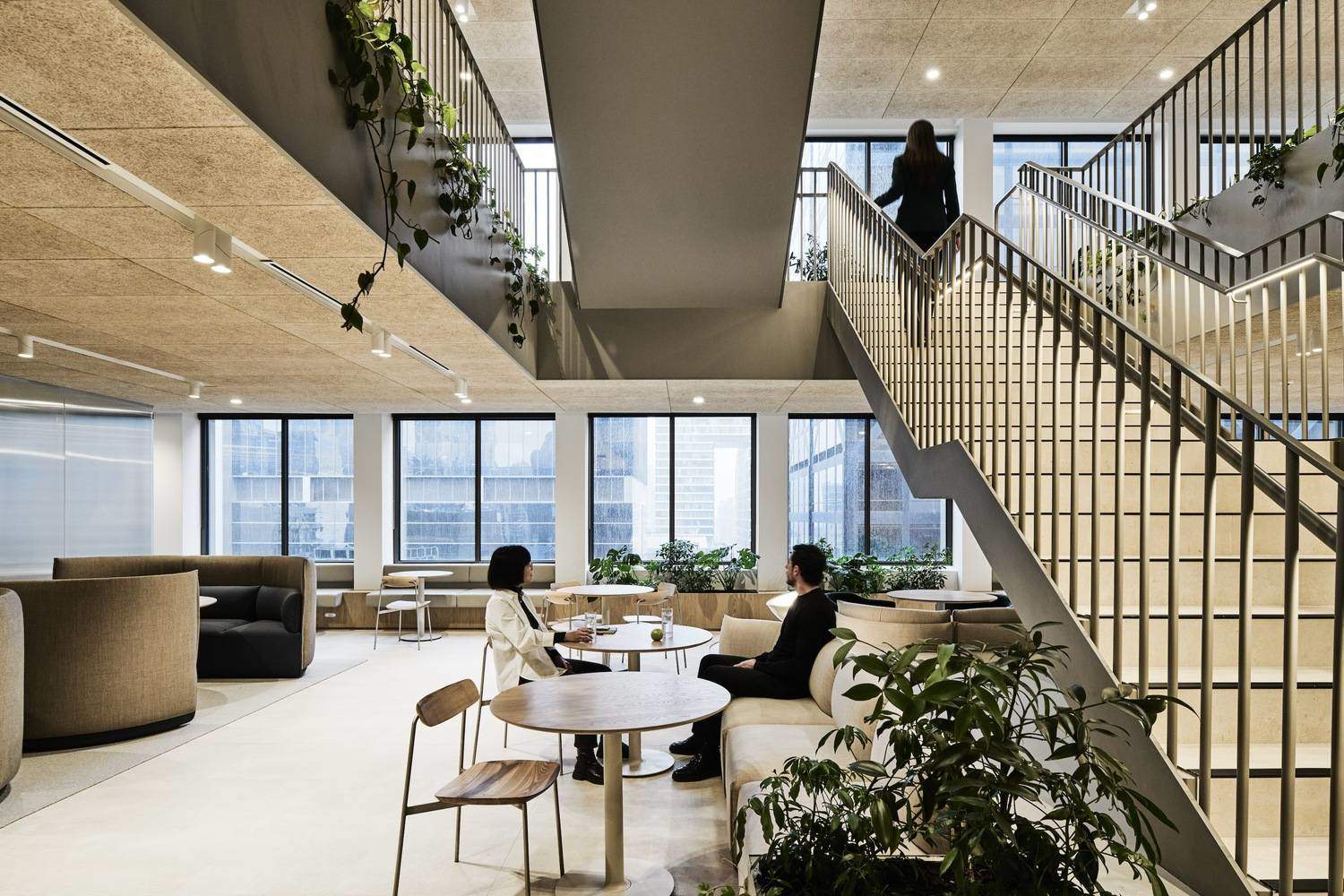 横跨所有四层休息空间的互连楼梯进一步促进了整个工作场所员工的联系,鼓励了行动和偶然相遇。种植经过精心策划,可以垂下楼梯空隙,为周围空间增添柔软元素,对用户的健康和福祉产生积极影响。工作场所的美学设计深受其位于500 Bourke范围内的地理位置的影响。灵感来自塔楼穿过立面的强大柱网连接,内部采用橡木制成的次级内部网格。