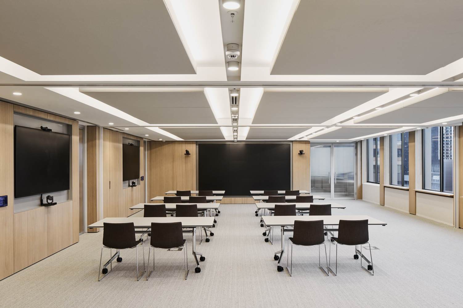 An interconnecting stair spanning between the breakout spaces of all four levels further promotes the connectivity of staff throughout the workplace, encouraging movement and chance encounters. Planting has been carefully curated to drape down the stair void and add an element of softness to the surrounding spaces, positively impacting the health and well-being of users.The workplace's aesthetic design has been significantly influenced by its location within 500 Bourke. Inspired by the tower's strong column grid articulation through the façade, the interiors feature a secondary internal grid using oak timber.