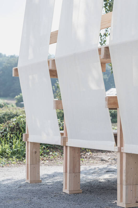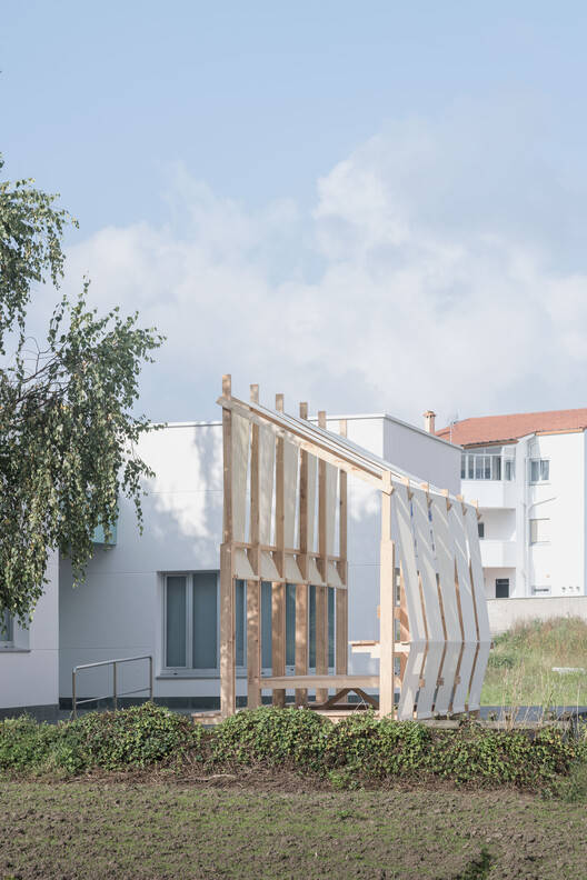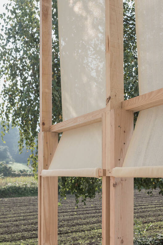 The design emphasizes fabric presence on the north side, highlighting the institution from afar while showcasing the wooden structure facing the building's façade. This creates a shared interior space complementing the civic center's access area. Platform platforms at different levels between these frames provide seating, shade, and a slightly elevated viewpoint overlooking the surrounding fields.