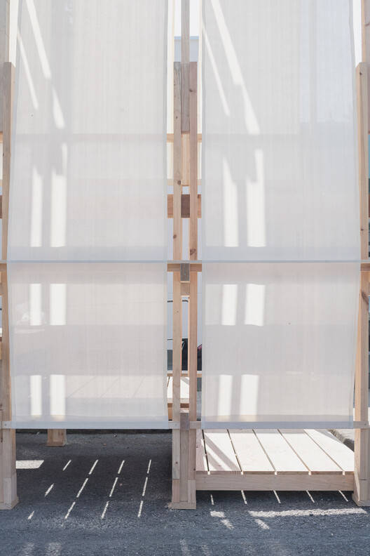 The existing building—a single-story pragmatic structure housing small multipurpose rooms—is set back from the road. This layout creates a paved parking space in front and a park to the south. The team decided to address the site's most challenging aspect: the front access sequence, including the parking area. The final installation combined various proposals into a modular structure. Six repeated frames rise to the building's façade height, covered with translucent fabrics—predominantly on the north façade and roof, and partially on the south.