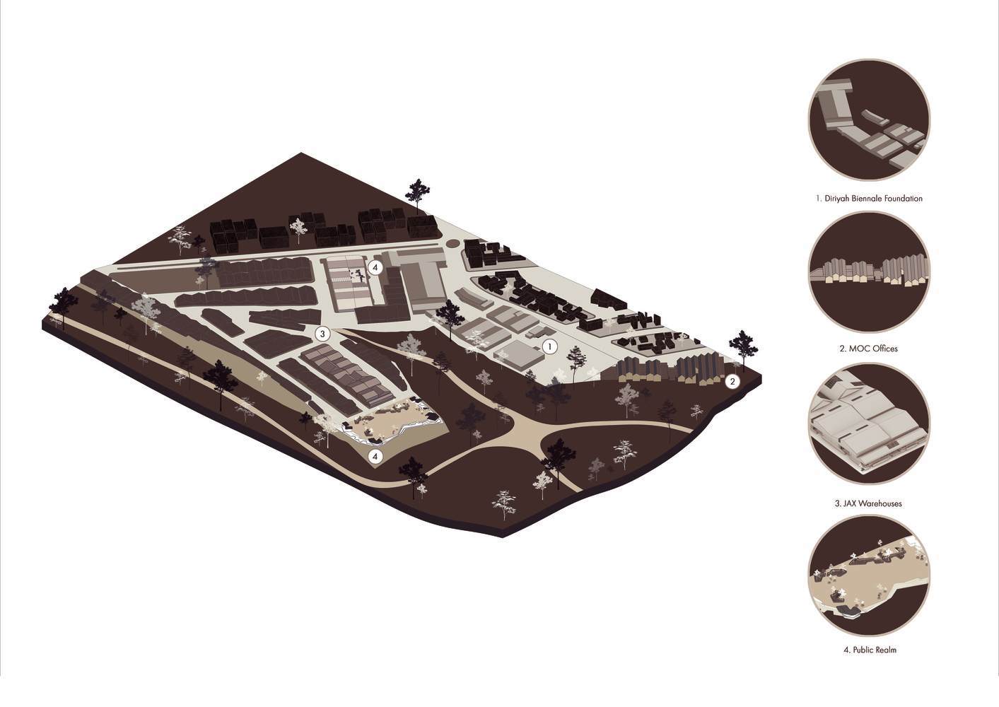 With its strategic location along the banks of Wadi Hanifa, Central Arabia's fertile valley, JAX has quickly become the nation's hub for the creative industries. Hosting the Diriyah Biennale Foundation, SAMOCA, and Noor Riyadh, while simultaneously offering subsidized spaces for artists, designers, and makers. Following the success of the Diriyah Biennale Foundation, the district's inaugural project, Bricklab established a strong relationship with JAX. In 2021, they were commissioned to develop the public realm guidelines for the Foster & Partners masterplan, and later in 2022, they won a competition to design a series of warehouses and public plazas.