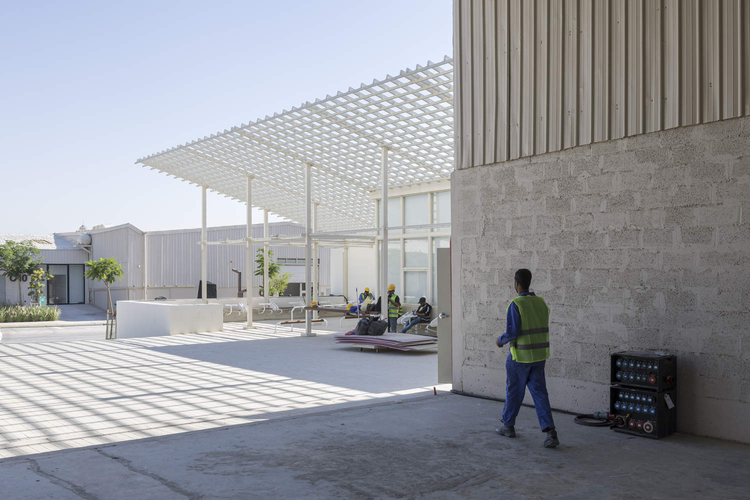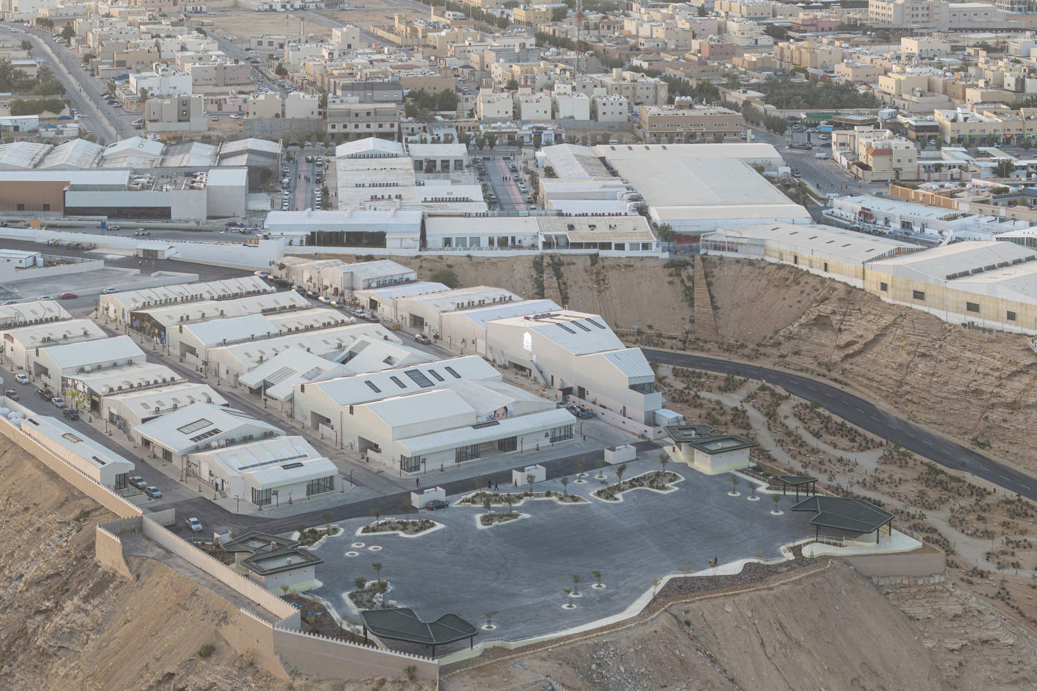 With a hundred warehouses and a set of different plazas within the street grid, the district was planned around principles of rehabilitation and adaptive reuse. Influenced by Wadi Hanifa's natural landscape informed the guidelines of the industrial site through materiality, color palette, and landscaping. The architectural language set for the district was based on a subtle combination of industrial materials, mindful paving, and a sensitivity to the functional requirements of creative production. At an urban scale, a set of pedestrian thoroughfares and public plazas were carved out from the strictly utilitarian assembly of structures throughout the site to establish nodes of public activity. These new plazas, sidewalks, and intersections are defined by landscaped pockets of irregular geometries developed by landscape architects studiolibani.