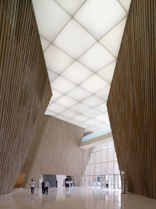 The formal main entrance plaza and main pedestrian entrance open to the south, while the northern entrance connects to the commercial area. The expansive roof canopy above the main entrance and the large outdoor auditorium form an active urban focal point.Once the adjacent office and retail complex is completed, the area will form an intertwining network of various functions, buildings, plazas and green spaces, integrating commerce and culture.