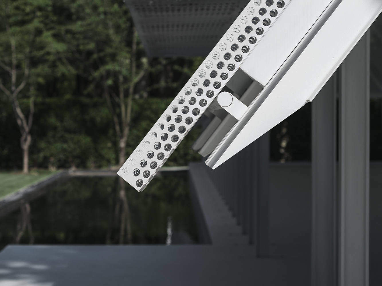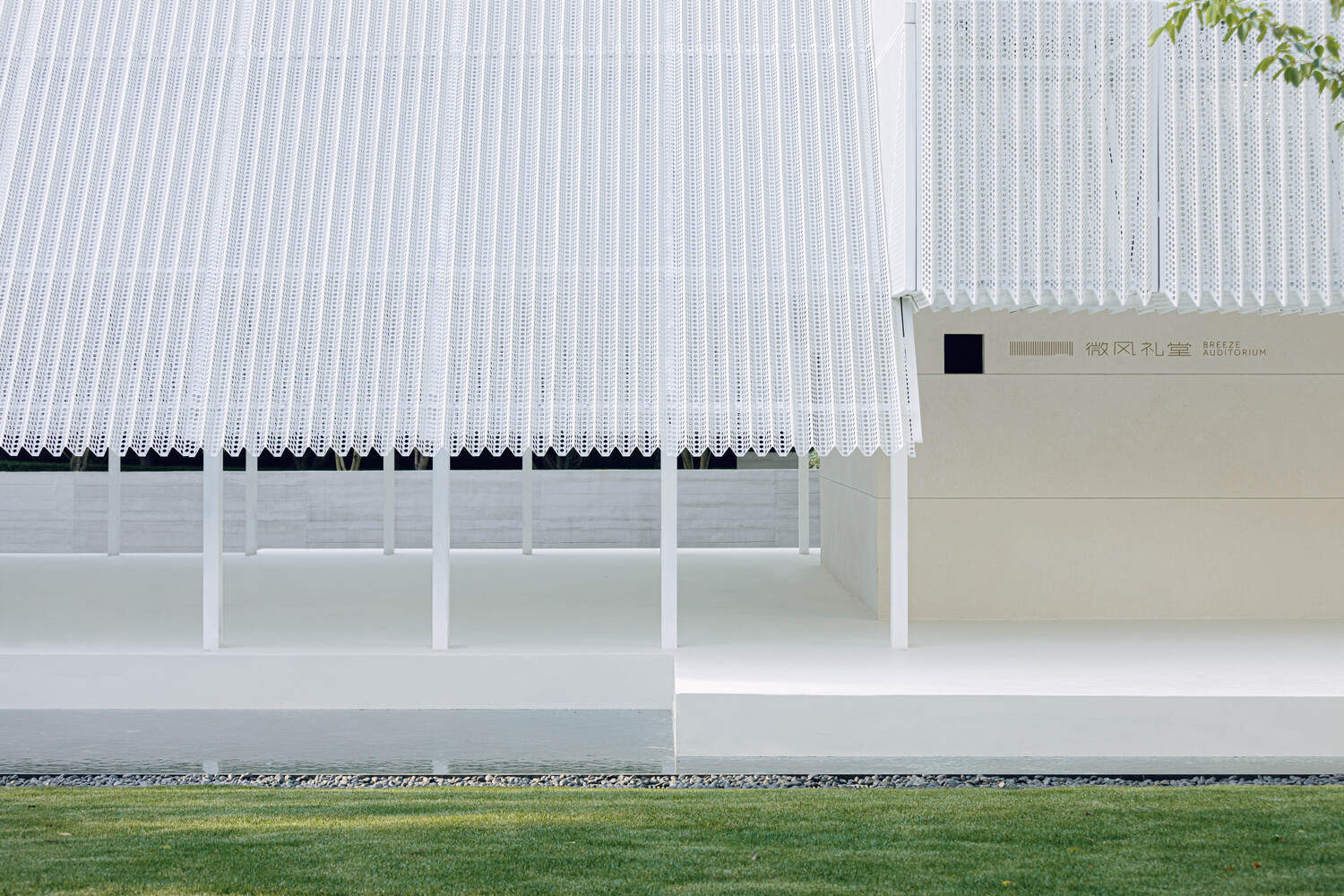 The Breeze Hall is regarded as a sanctuary that carries the collective memory of the city. It not only has a stunning, breath-taking, and oversized ritual space but is also filled with details and materials that are human-scaled. The low eaves intentionally channel rainwater into a pool for collection, relying as little as possible on artificial supply; the double-layer perforated panels utilize the profile of the roof structure to achieve wind extraction, while the gaps left at the ridge interact with the evaporation of the pool, creating a local microclimate with gentle breezes that flow through even in the sweltering summer. Inside the second-floor platform, the beige plaster has a soft touch, imparting a skin-like texture to the space. The handrails of the ribbon windows transform into arcs, making it easier for palms to rest, allowing for longer stay. Throughout the space, the tectonic details are clearly showcased to make the architecture itself detailed in human scale instead of using excessive ornaments.