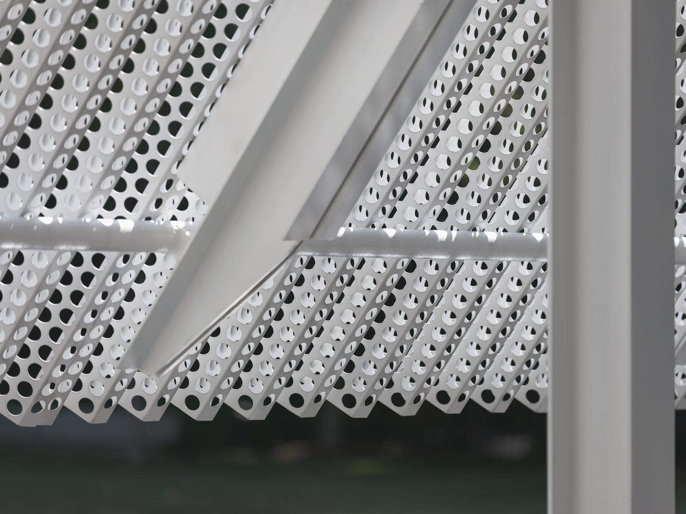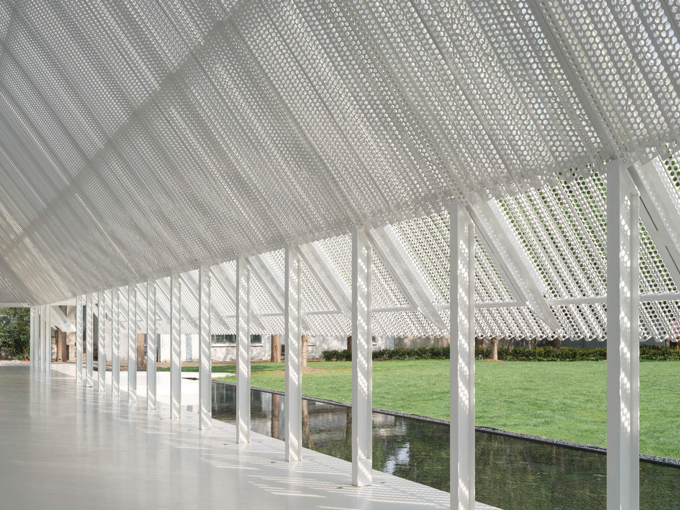 结构与环境的和谐:主楼的设计展现了翼状钢结构与景观式基础的完美结合,创造了一个既轻质透明又结构高效的空间。这种设计不仅满足了多功能空间的需求,还通过预制穿孔板屋顶和双层穿孔板的设计,提供了独特的视觉和感官体验。这些细节的处理显示了设计师对材料和光影运用的精湛技艺。