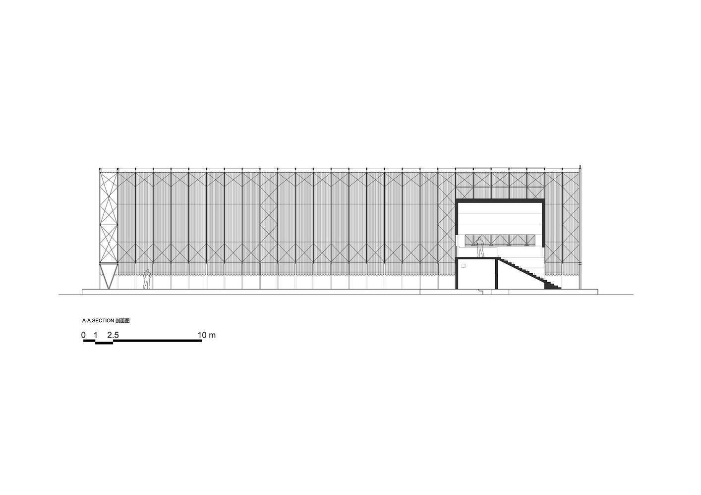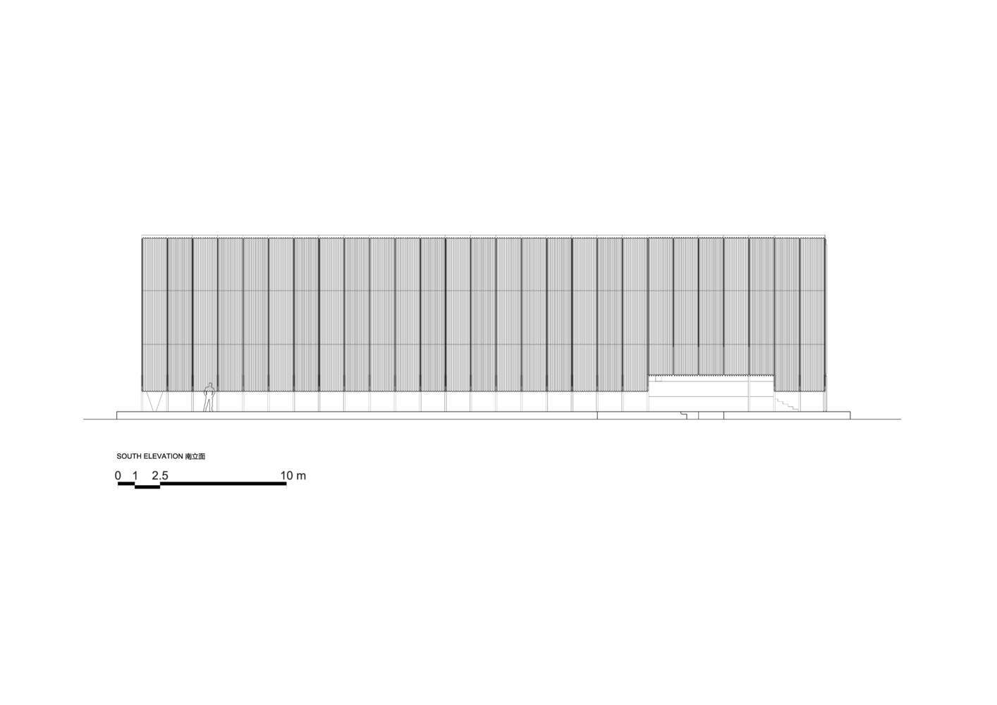 建筑师提供的文字描述Text description provided by the architects. The Breeze Hall is located in Lu Xun Park, the most important memorial park in Shanghai. It originated from a patch of mixed woods on the south side of the Lu Xun Memorial Museum, which was fenced off and designated as a dead corner left by urban development. In 2023, SHISUO Design Office was commissioned to reorganize this site—some trees were transplanted to the south, creating a walkway together with the existing trees in front of the Lu Xun Memorial Museum, and also providing a soft boundary for the new building. Other trees were moved to the flanks of the site, forming a large enclosed open space. Large trees and bamboo within the site were retained, and the newly placed pathways harmoniously interacted with them——All these adjustments endow the site with greater publicness.