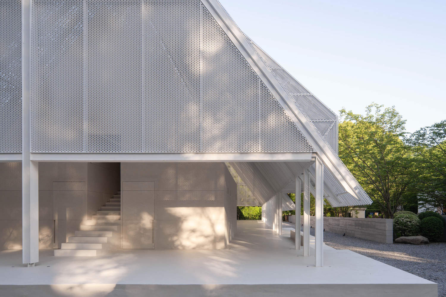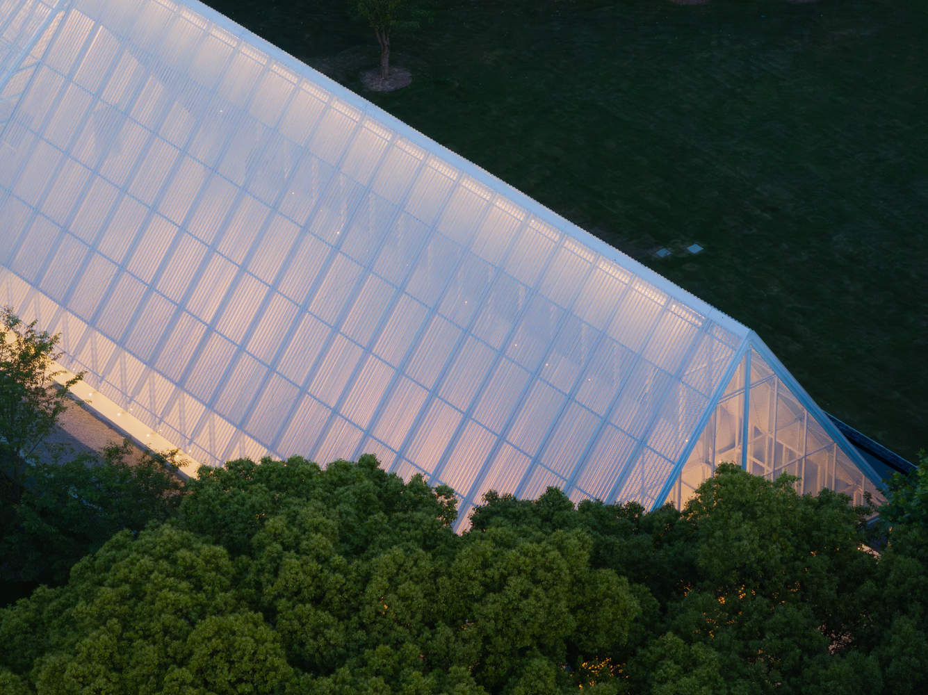 The main building consists of a wing-like steel structure and a landscape-like base. The slender steel structure is arranged to be lightweight and transparent while achieving high structural efficiency. Steel columns of only 100*150mm support an open space measuring 42m in length, 15m in span, and 12m in height, catering to the needs of weddings, events, exhibitions, and gatherings. The roof is made of prefabricated perforated panels, and the modular assembly ensures quick construction on-site. This porous material provides varying visual experiences at different scales, appearing simple at first glance but revealing intricate details upon closer inspection. The double-layer perforated panels also act as a filter between the interior and the exterior—calm on cloudy days and warm on sunny days. The roof's shape transforms at the entrance, inviting people to come in. The interior space is lofty and expansive, resembling a blank canvas that allows users to add color later.
