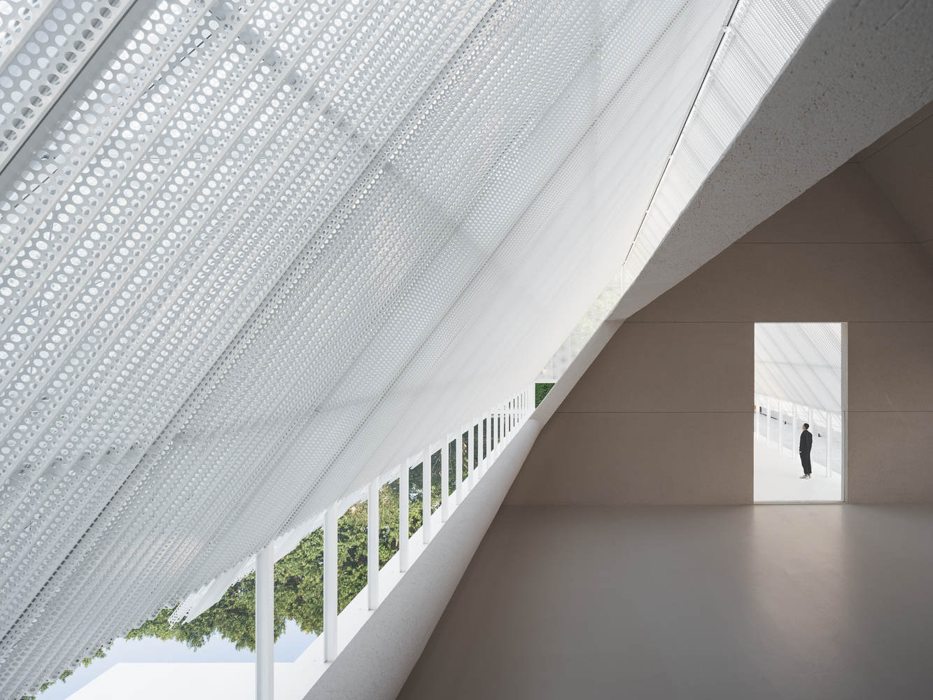 主楼由翼状钢结构和景观式基础组成。细长的钢结构被布置为轻质透明,同时实现了高的结构效率。仅100*150mm的钢柱支撑着一个长42米、跨度15米、高12米的开放空间,满足婚礼、活动、展览和聚会的需求。屋顶由预制穿孔板制成,模块化组装确保了现场施工的快速进行。这种多孔材料在不同尺度上提供了不同的视觉体验,乍一看很简单,但仔细一看就会发现复杂的细节。双层穿孔板也起到了内部和外部之间的过滤器的作用——阴天平静,晴天温暖。屋顶的形状在入口处发生了变化,吸引人们进来。内部空间高耸而广阔,就像一块空白的画布,用户可以在以后添加颜色。