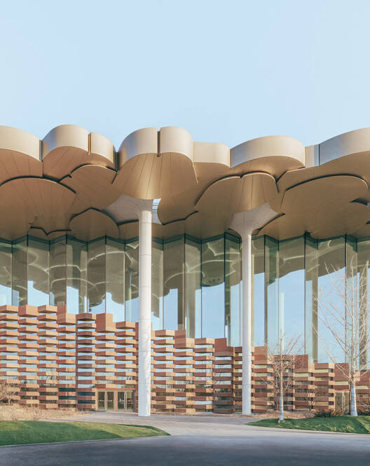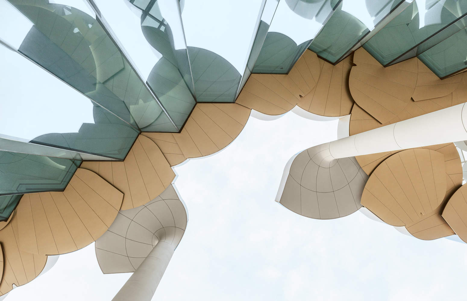 The use of modular components and a rationalized structural grid reduces the manufacturing waste for the building. For the ginkgo tree columns, a single module type is rotated on a 9x9m grid throughout the building to give the appearance of variety while being efficient to fabricate and install. These columns also house integrated technology to control interior climate, lighting, and acoustics, as well as collect rainwater from the roof to be reused for irrigation by channeling it to a green infrastructure system.