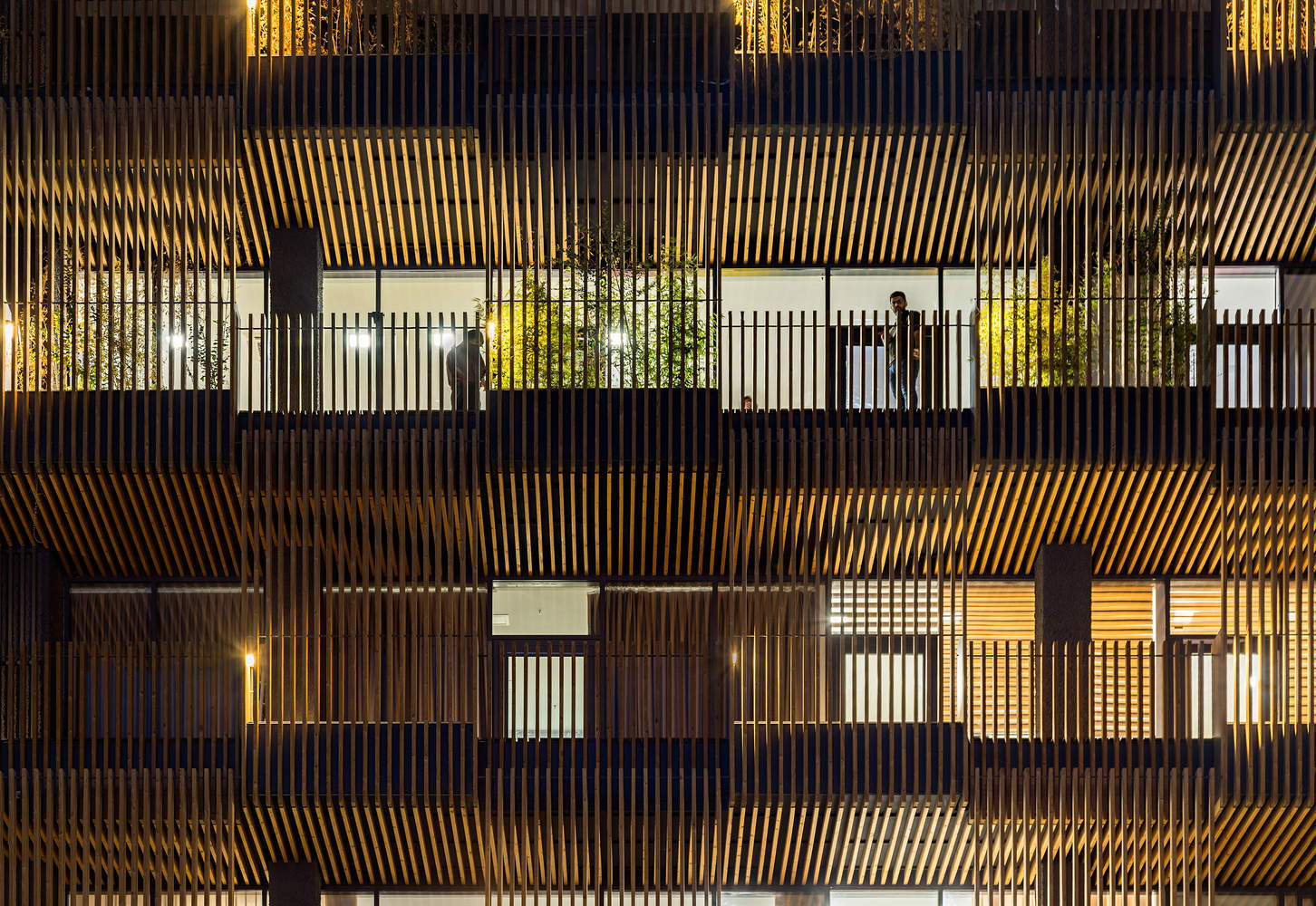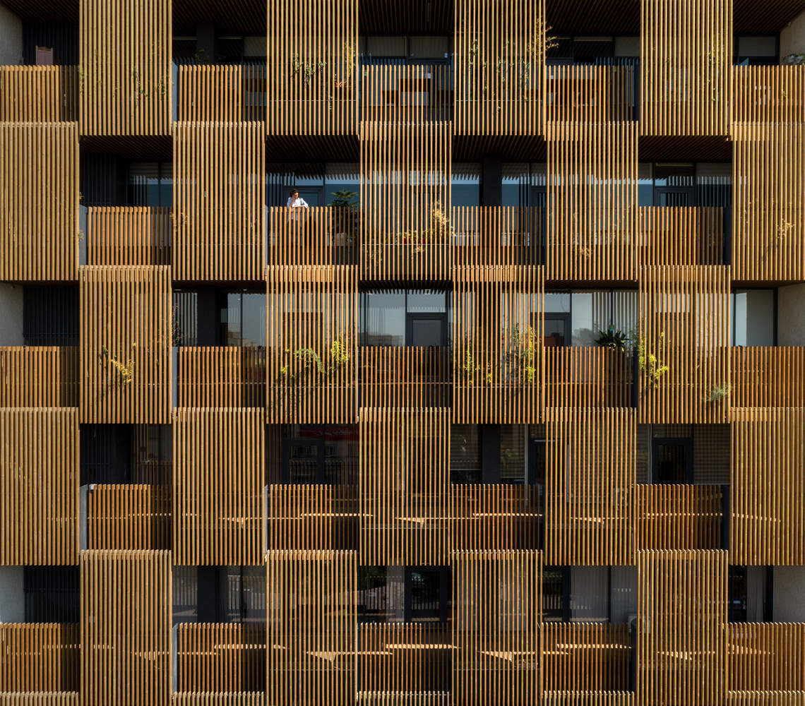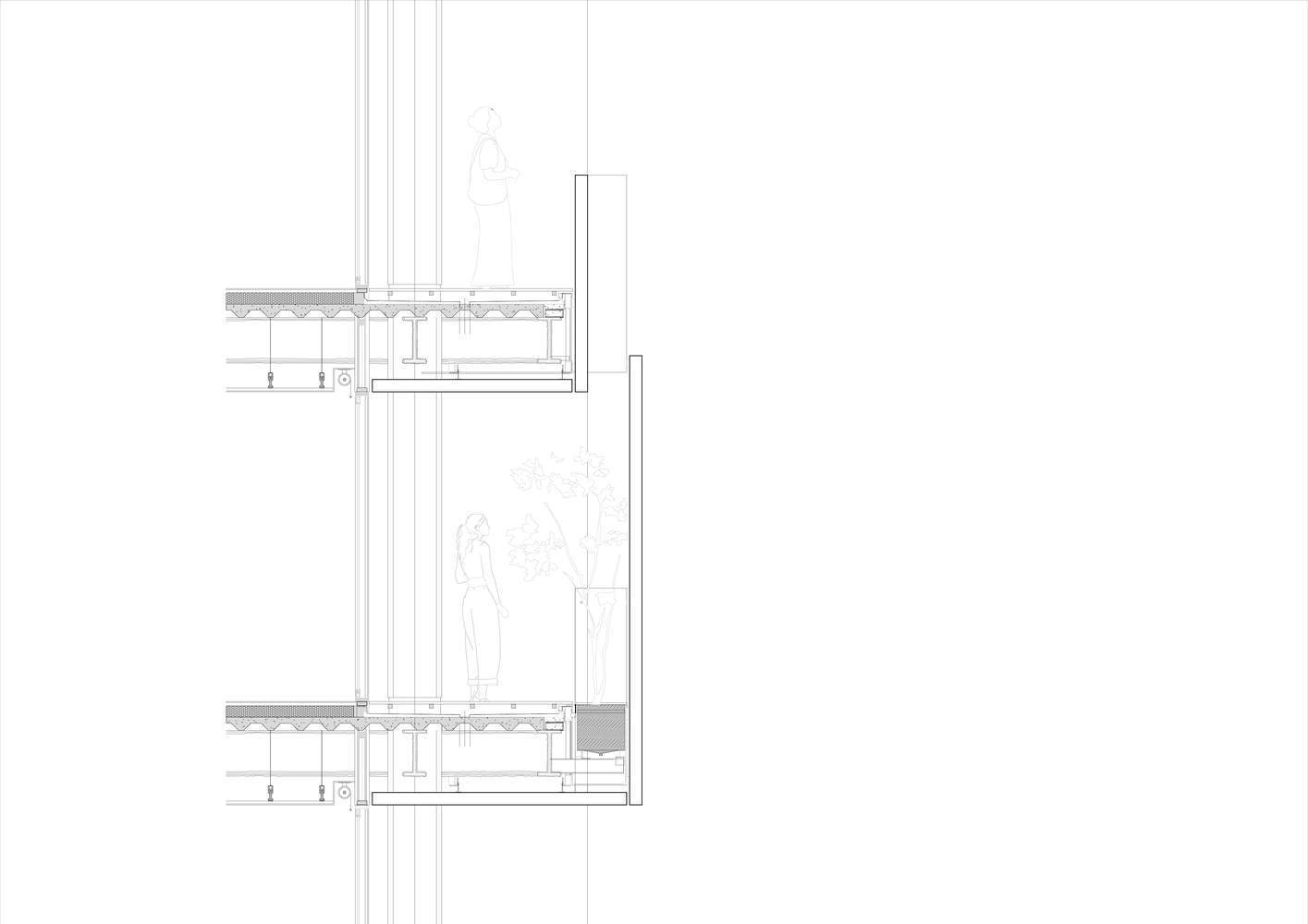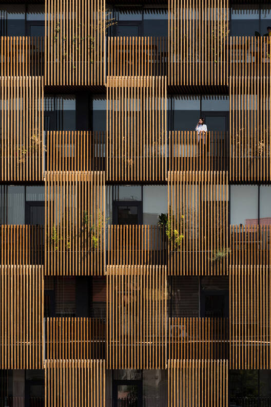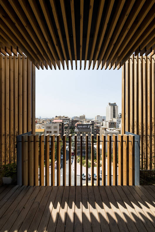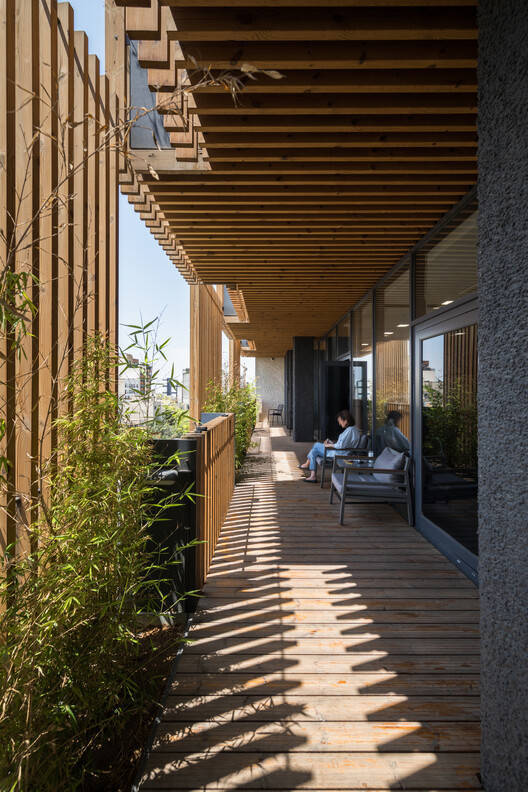 为了实现这一目标,建筑和城市之间的边界由两个不同的层定义。第一个更靠近内部,由大而透明的窗户组成,让自然光充满空间,提高了可见度和开放性。第二层是半透明的,由木栏杆和钢花盆组成,形成了一个可渗透的屏幕。外层充当过滤器,调节光线和气流,同时为乘客提供隐私感。这两层之间的空间成为了一个活跃的区域——部分开放,既服务于功能和美学目的,又软化了建筑与其城市环境之间的过渡。