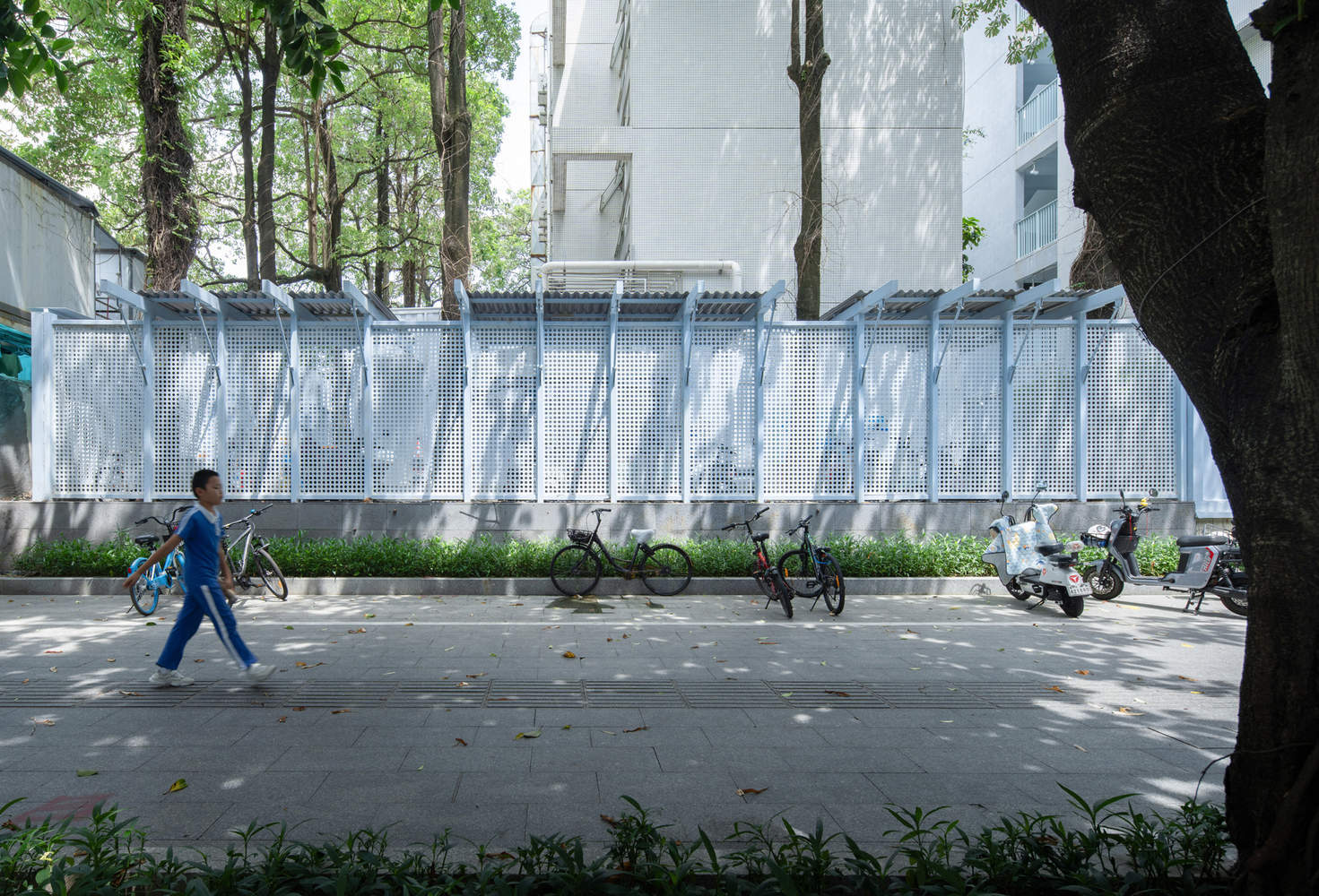 Taking advantage of the pillars of the fence itself and the height difference between inside campus and outside street, we built a one-way cantilevered bicycle shed based on a part of the fence, with diagonal tensile rods tied to the outside of the fence. The plan is staggered along the linear fence according to the location of the original trees, and the roof is covered with a single layer of lightweight corrugated aluminum panels. The original thin wall interface is extended here as the thickness of the use space.