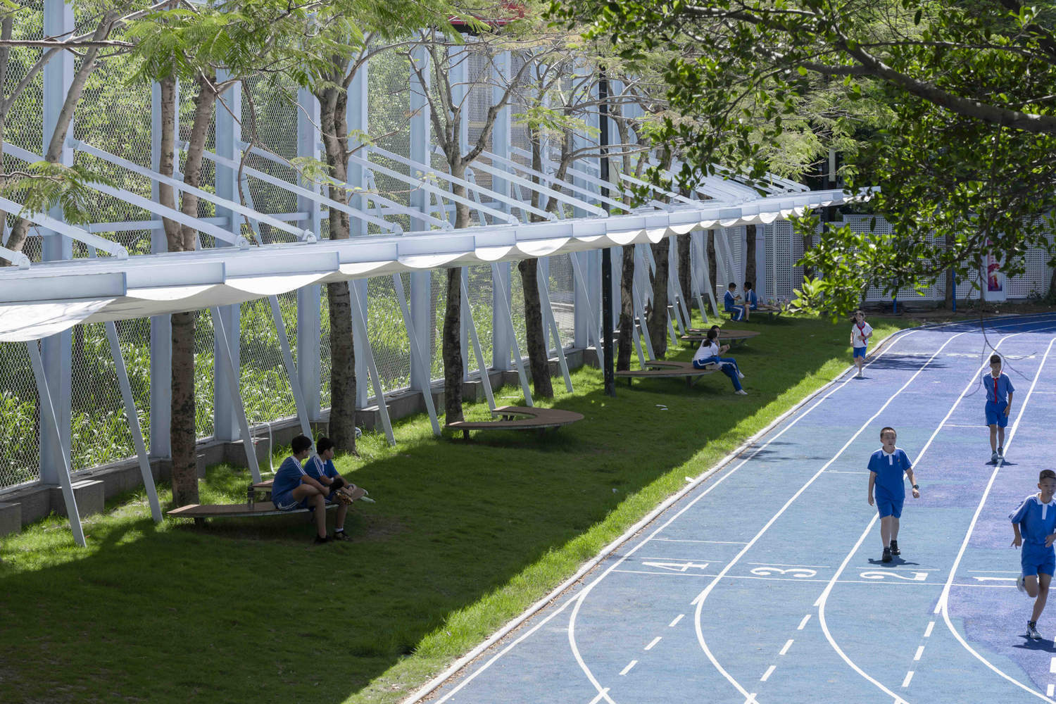 空间创新与功能拓展:南海小学的改造项目巧妙地利用了校园内外的空间结构差异,通过引入入口走廊、停车棚、折叠庭院等元素,重新激活了原本的“剩余空间”。这种设计不仅满足了功能需求,还丰富了校园的空间层次。特别是在垂直空间的拓展上,通过增加屋顶多功能棚屋、屋顶花园等,有效地扩展了校园的使用面积,同时也适应了亚热带气候的特点,创造出无需空调即可使用的舒适空间。这种对空间的深度挖掘和创新利用,体现了设计师对校园功能与美学的双重追求。