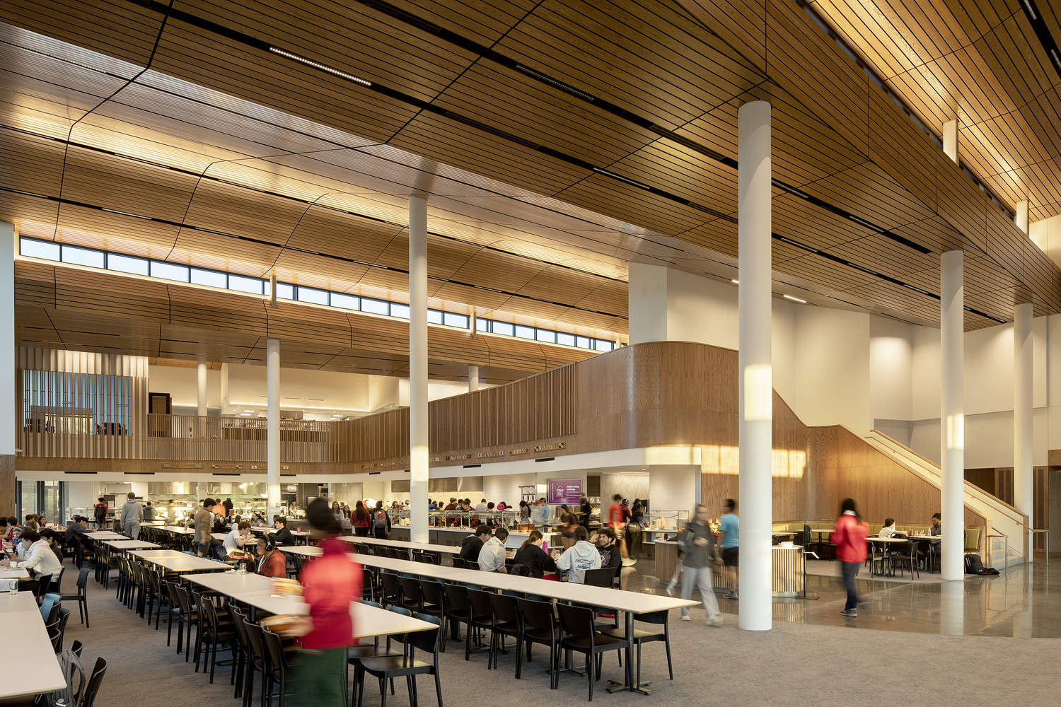 A design approach to circulation. This project merges the general student with the athlete student, by including the dining component under the same roof. This important decision, driven by the school to ensure that the building belongs to everyone, has a great impact on the everyday life on campus, as it becomes the everyday center where students meet for multiple activities throughout the day. The new dining facility accommodates over 500 students, staff, and faculty daily. The design includes a mezzanine dedicated to first-year students as a way to create a sense of belonging and community.